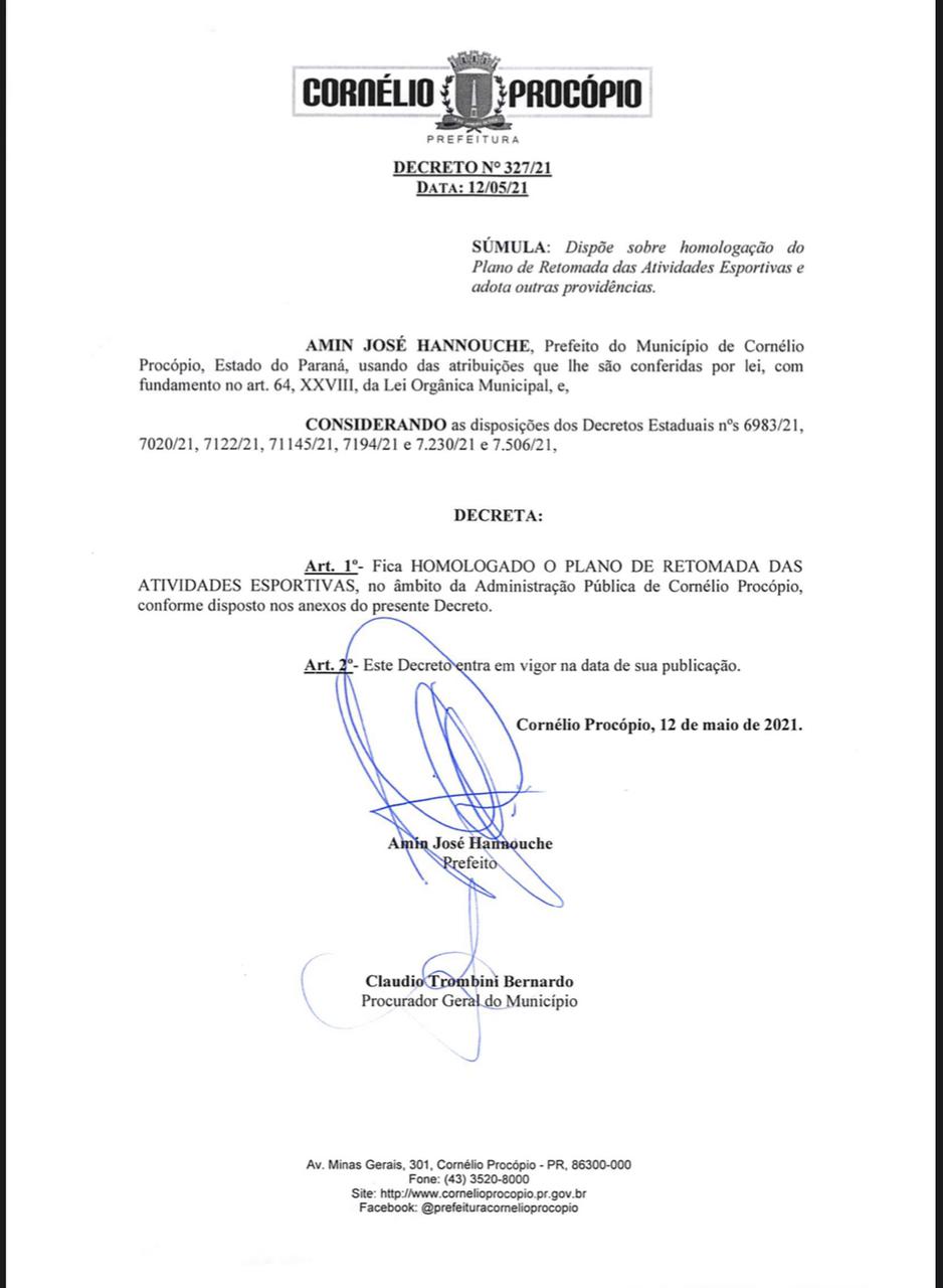 Decreto Municipal libera a prática desportiva em Cornélio Procópio