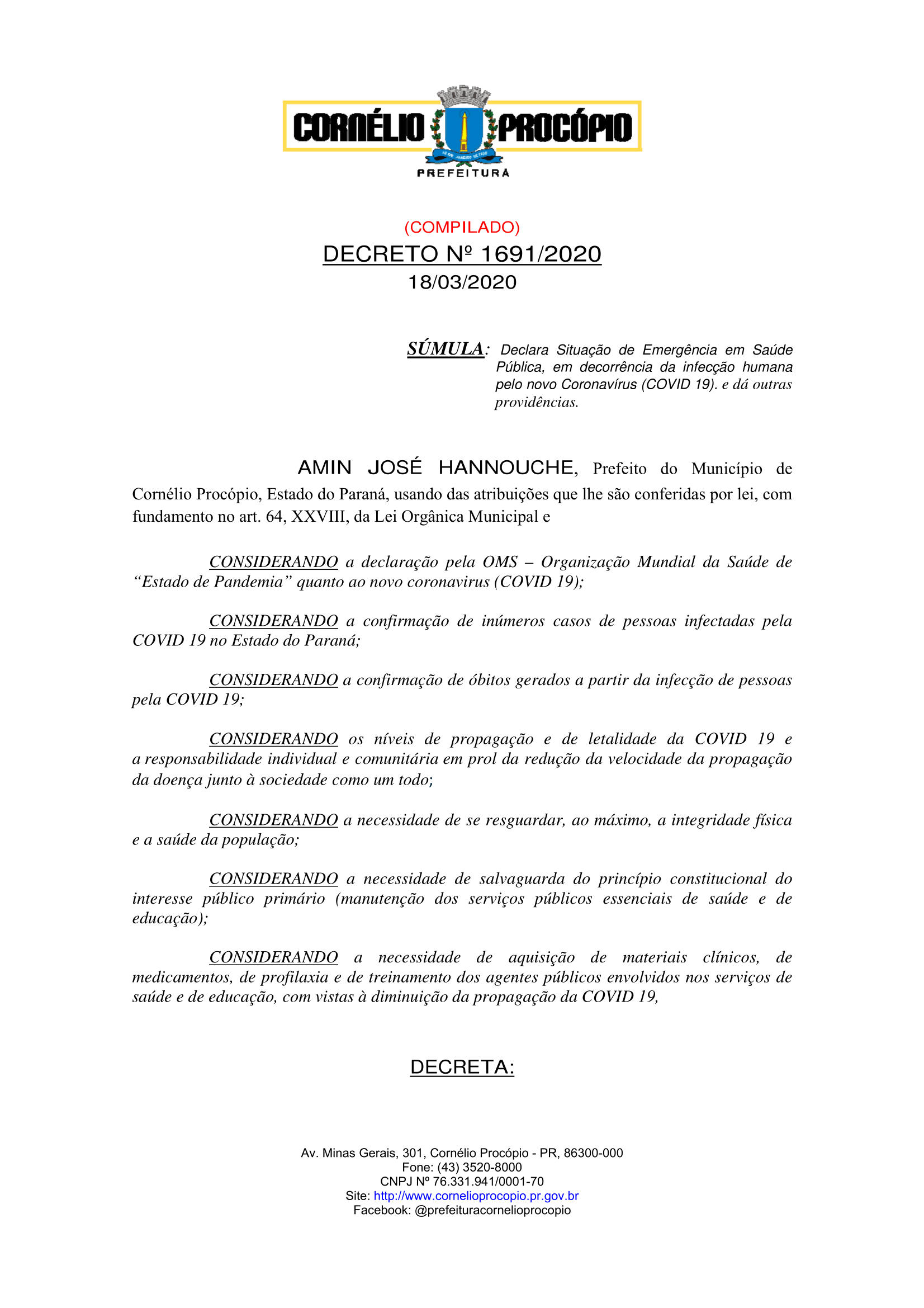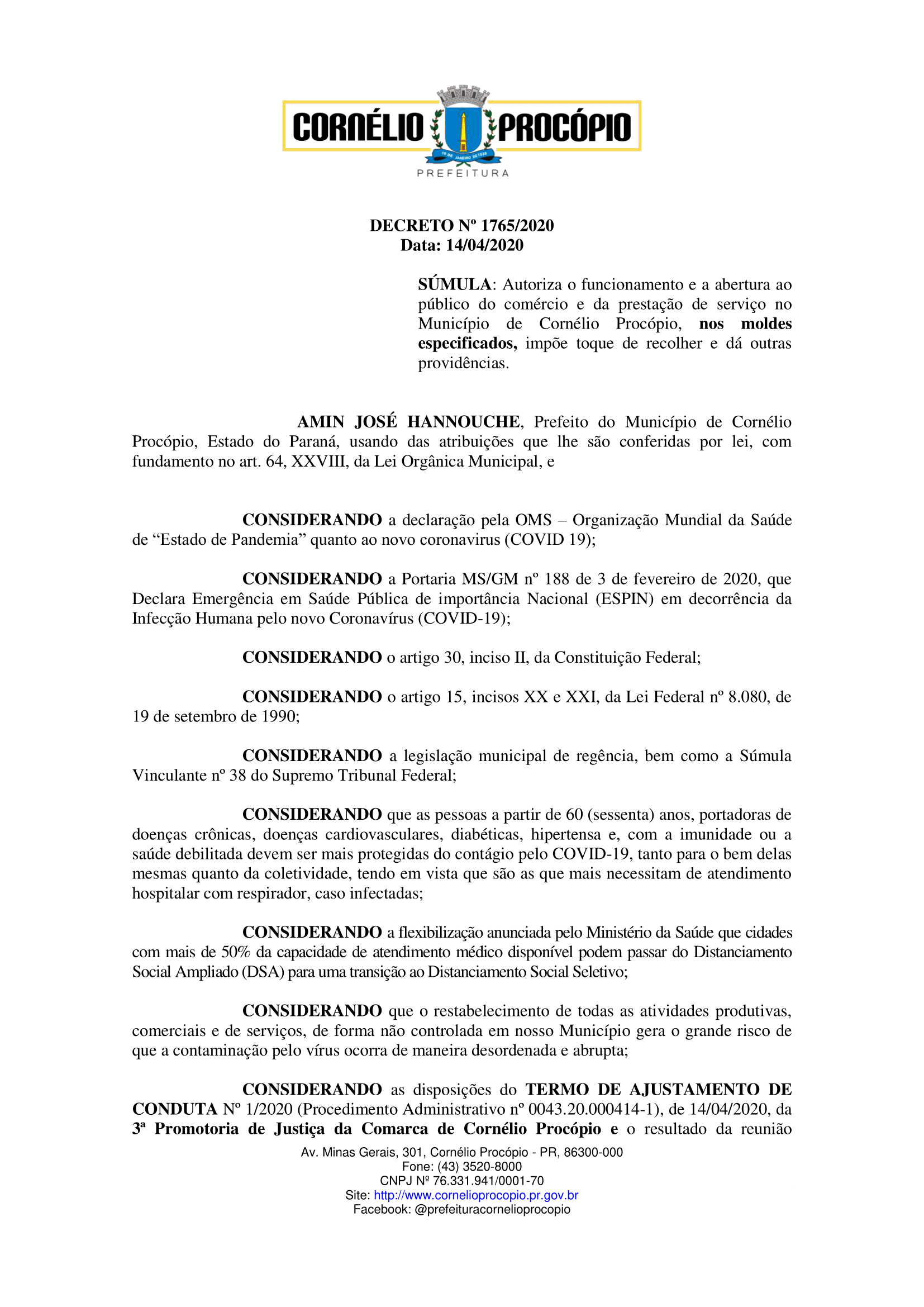 Decreto nº 1765/2020 - Covid-19 e Providências