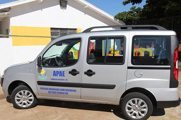 A primeira-dama do município e presidente do Provopar, professora Lúcia de Fátima Cardoso Alves, representou o prefeito Fred Alves na entrega simbólica das chaves de um veículo utilitário à APAE (Associação de Pais e Amigos dos Excepcionais) que funciona na Escola de Educação Especial Procopense. A solenidade foi na manhã desta segunda-feira, dia 15, no interior da escola, na presença de alunos, diretores e professores da instituição. O veículo foi adquirido com recursos do Fundo Estadual para a Infância e Adolescência (FIA/PR) e entidades sociais da cidade. O veículo, um FIAT doblò, com espaço interno para até sete ocupantes, será utilizado em serviços diversos da instituição, principalmente nas visitas de assistentes sociais.