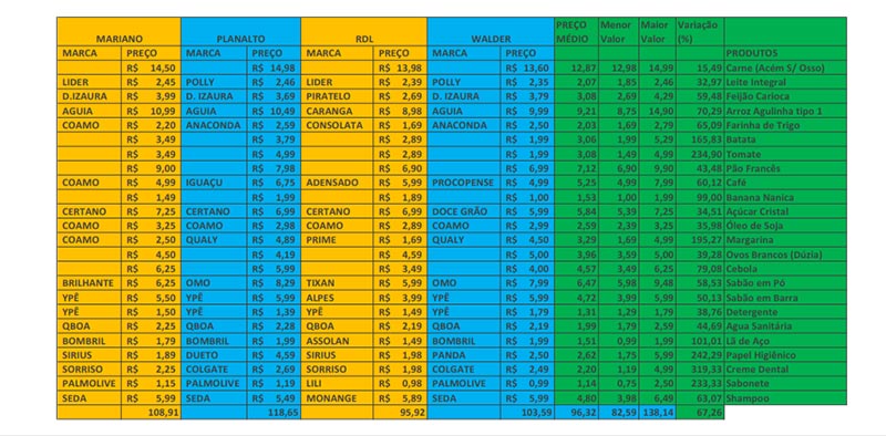 Nesse mês de setembro a variação encontrada chegou à 319,33% em um produto, mas a diferença geral entre os produtos mais baratos e os mais caros chegou à 67,26%, ja entre os supermercados a diferença de um local para outro chega à 38,91% , o coodenador do Procon municipal EDENILSON MARIA DE SOUZA , lembra que se os consumidores utilizarem essa ferramenta como meio de compra podem economizar um bom dinheiro ao adquirir esses produtos.
