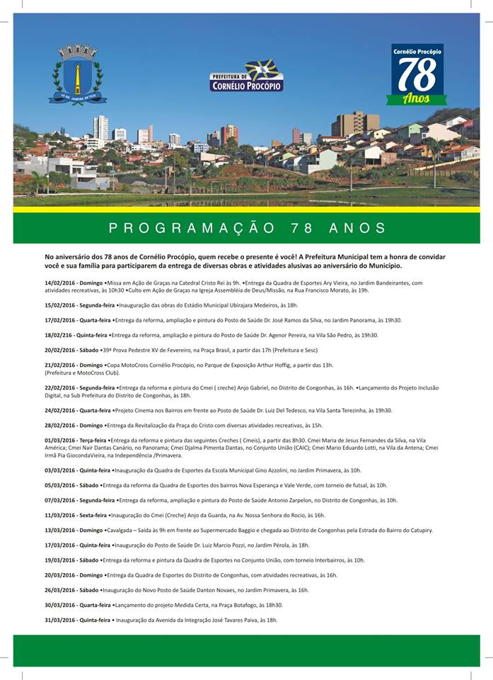 No aniversário dos 78 anos de Cornélio Procópio, quem recebe o presente é você! A Prefeitura Municipal tem a honra de convidar você e sua família para participarem da entrega de diversas obras e atividades alusivas ao aniversário do Município.