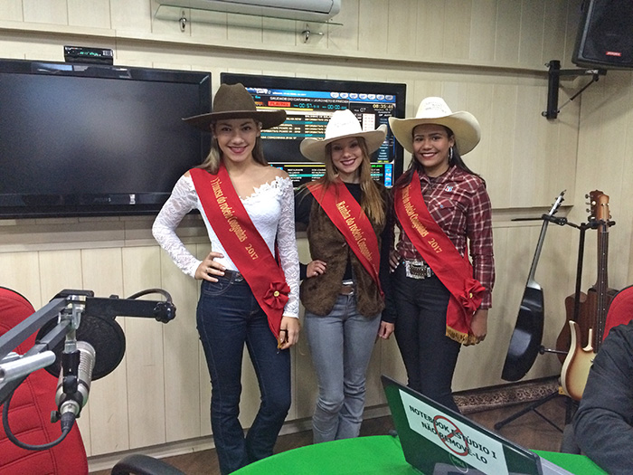 Cornélio Procópio – Emissoras de rádio de Cornélio Procópio receberam na manhã deste sábado, dia 29, a visa das jovens Amanda Aparecida Iani, Thaynara Oliveira e Gabriely Sthafani Gomes Chaves eleitas rainha e princesas do Rodeio do Distrito de Congonhas, que acontece entre os dias 5, 6 e 7 de maio naquela localidade. Acompanhadas dos vereadores Élio Janoni e Edmar Gomes Filho, elas participaram de programas jornalísticos e de entretenimento para convidar a população local e regional para o grande evento. O Rodeio de Congonhas deverá atrair milhares de pessoas em um espaço totalmente preparado para a festa, localizado na entrada do distrito. Todos os detalhes estão sendo finalizados pela subprefeitura do distrito e pela Prefeitura de Cornélio Procópio. A Comissão Organizadora agradeceu ao prefeito Amin Hannouche e à primeira Dama, Mary Hannouche, Secretária de Ação Social e ao subprefeito Giancarlo Janoni pele empenho na realização do Rodeio. O ingresso para a promoção será um produto de limpeza que será revertido às entidades assistenciais. Para quem quiser visitar o local, a opção é desfrutar do Parque de Diversões, que já está instalado e atendendo os visitantes. (Comunicação/Prefeitura)