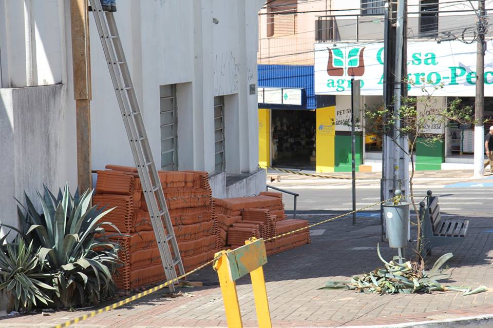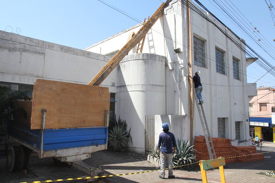 Operários trabalham na troca de todo o telhado do prédio que estava comprometido pela ação do tempo