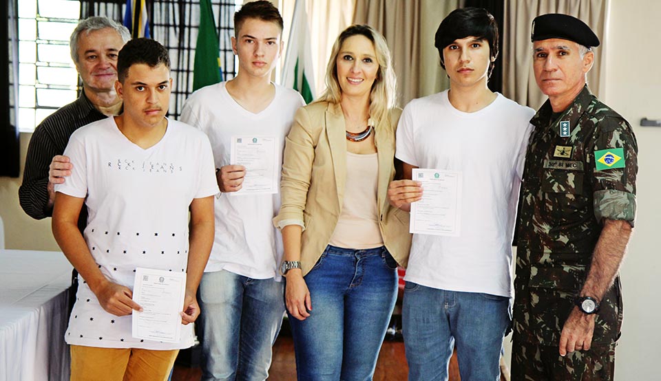 Cornélio Procópio -Foi realizada recentemente, no salão de festas do Colégio Nossa Senhora do Rosário, a cerimônia de Compromisso à Bandeira dos Jovens da Classe de 2017 e anteriores, dispensados do Serviço Militar Inicial em Cornélio Procópio. Na oportunidade os dispensados receberam os Certificados de Dispensa de Incorporação das autoridades presentes. A solenidade foi presidida pelo Capitão do Exército, Donizete Aparecido Repukna e contou com a presença da vice-prefeita Angélica Olchaneski, do vereador Ismar Medeiros da Nóbrega, do Chefe de Instrução do Tiro de Guerra 05/002, Subtenente Geraldo Dilamar das Chagas Vieira e Subtenente Natanael Rodrigues Albuquerque, do presidente do Conselho Municipal de Segurança Pública, Assad Amin e assessores da prefeitura e da Junta do Serviço Militar de Cornélio Procópio. Segundo o Capitão Repukna, Chefe da 15ª Circunscrição do Posto de Recrutamento e Mobilização do Serviço Militar de Apucarana, os dispensados do Serviço Militar poderão ser convocados em qualquer momento pelo Exército Brasileiro, mesmo não tendo sido efetivado na turma que está servindo o Exército no TG 05/002. Ele destacou a importância do Exército Brasileiro nos momentos mais difíceis do país. A vice-prefeita Angélica Olchaneski, que representou o prefeito Amin Hannouche, que preside a Junta do Serviço Militar em Cornélio Procópio, também enalteceu o Exército Brasileiro e chamou a atenção dos jovens da importância do amor à Pátria e da efetiva disposição caso sejam solicitados. "Nossa Pátria precisa estar atenta todos os dias para termos assegurados tantos direitos institucionais que temos e tudo isto passa pela vigilância do nosso Exército", disse a vice-prefeita Angélica Olchaneski. (Comunicação/Prefeitura)