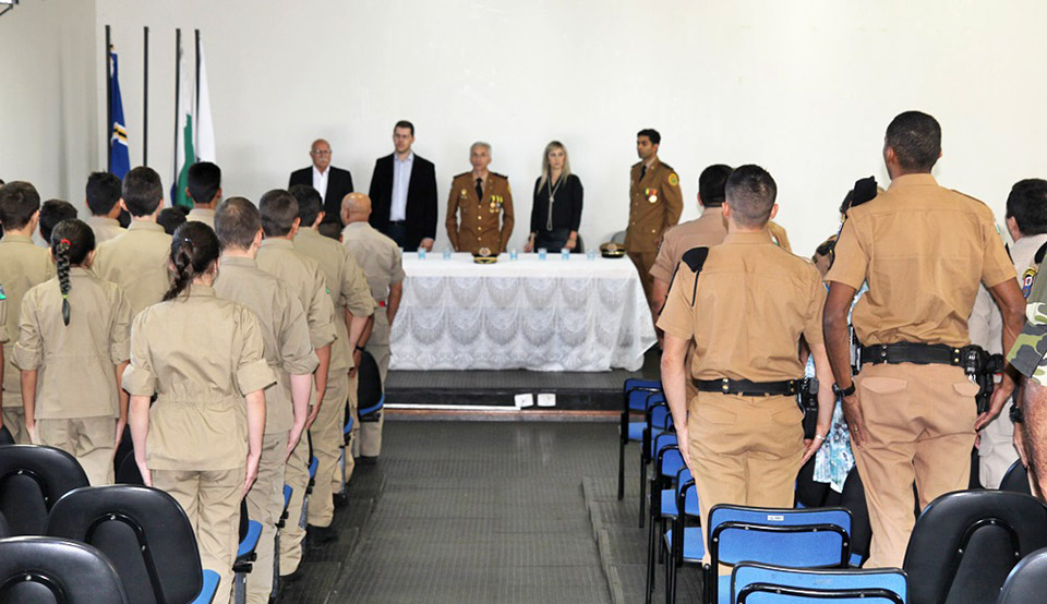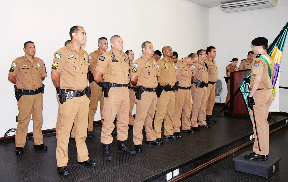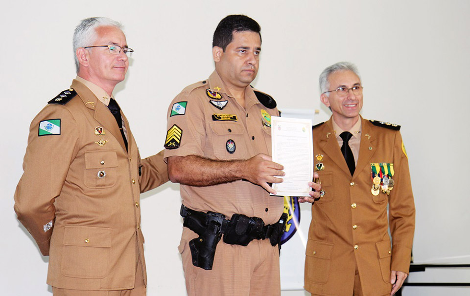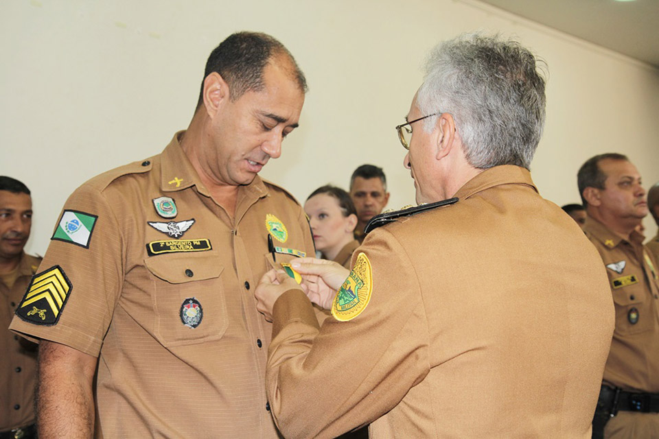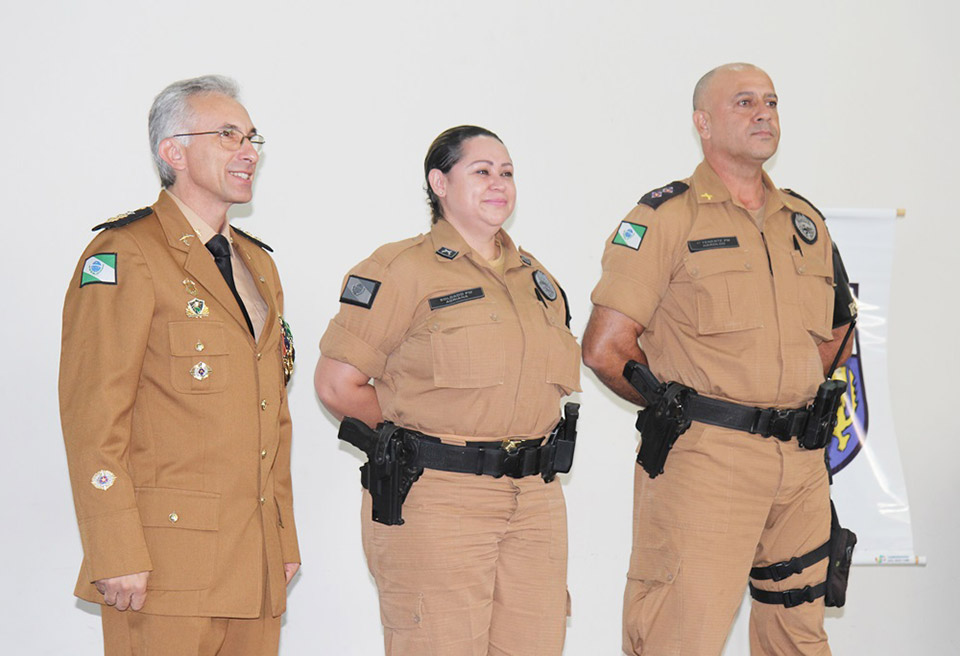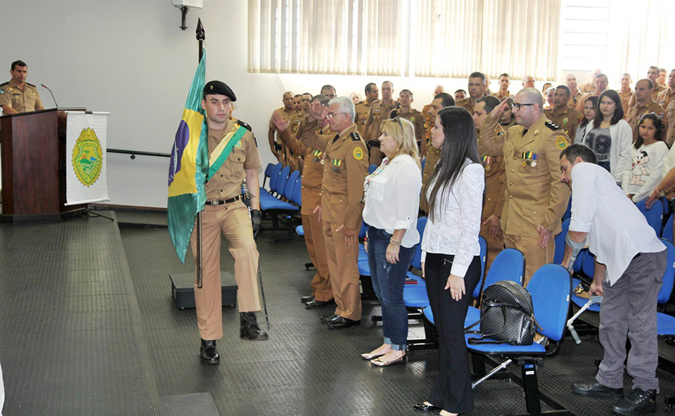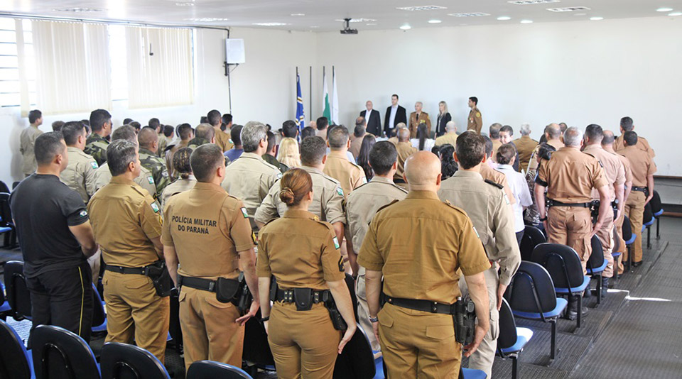Cornélio Procópio – O auditório da Uenp foi palco recentemente, da cerimônia de comemoração ao Dia do Patrono da PM Coronel Sarmento no último dia 17 (Quinta-feira). A cúpula da Corporação, representantes da Sociedade Civil Organizada e a vice-prefeita Angélica Olchaneski de Mello, que representou o prefeito Amin Hannouche, acompanharam o evento. Militares que atuam no 18º Batalhão da PM foram agraciados com honrarias e medalhas por seus méritos no serviço à comunidade. Segundo a Policia Militar do Paraná, o coronel Sarmento é um ícone para a Corporação, símbolo de coragem, de servir à sociedade, “pois sofreu em seu próprio corpo feridas em razão das batalhas que lutou, e não tem como deixar de reverenciar alguém que é uma referência para toda a Polícia Militar, então todos os anos comemoramos essa data”, diz a nota oficial enviada pela cúpula da PM no Paraná. Durante a solenidade, presidida pelo Coronel Luiz Roberto Costa, Comandante do 18º Batalhão da Policia Militar de Cornélio Procópio, a Polícia Militar prestigiou os oficiais e praças da corporação que concluíram 30, 20 e 10 anos de serviços prestados com entregues das medalhas “Policial Militar” de ouro, prata e bronze. Também foram homenageados o 2º Sargento Alencar Gonçalves da Silva, elogiado pelo Comandante do 2º Comando Regional de Polícia Militar- Londrina; a Soldado Hilana Doralice Barbosa Borges por ter se destacado no mês de março no desempenho da atividade policial militar e a Soldado Adriana que após um ano de estágio no Grupo Especializado “Ronda Ostensiva Tático Móvel” (ROTAM) recebeu o Braçal de membro do grupo. Participaram da solenidade a vice-prefeita de Cornélio Procópio Angélica Olchaneski de Mello, o Delegado Adjunto da 11ª SDP Luciano Purcino, o Comandante do 3º Subgrupamento de Bombeiro Capitão Angelino José de Siqueira, o Presidente do Conselho de Segurança de Cornélio Procópio, Assad Amin, policiais da 2ª Cia do Batalhão de Polícia Ambiental (Londrina), oficiais e praças do 18° Batalhão de Polícia Militar, bombeiros militares, bombeiros mirins e demais convidados. Comunicação/Prefeitura)