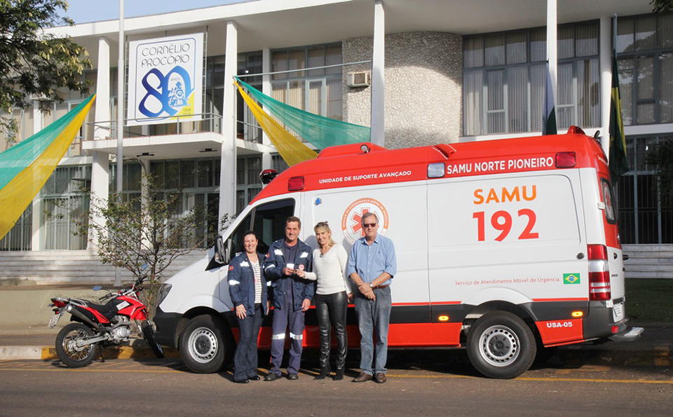 Cornélio Procópio - A Prefeitura de Cornélio Procópio recebeu recentemente um importante reforço na área de saúde. O SAMU – Serviço de Atendimento Móvel de Urgência do município conta com uma nova ambulância para atender a grande demanda existente. De acordo com a vice-prefeita Angélica Olchaneski de Mello, Secretária Municipal de Saúde, o prefeito Amin Hannouche tem se empenhado muito para que a frota do SAMU seja renovada com veículos novos que atendem a necessidade existente. A nova Ambulância, modelo Mercedes Benz Sprinter 415 CDI, é um veículo de emergência básico completo, totalmente equipado, incluindo GPS, câmera de ré e demais equipamentos de atendimento de urgência. Um veículo como este custa R$ 176 mil. Para a Prefeitura de Cornélio Procópio, no entanto, a nova ambulância não teve custos. Ela foi destinada ao município pelo Ministério da Saúde, já que o município havia cadastrado pedido do veículo no sistema federal há poucos meses. O apoio dos deputados que representam a cidade também foi fundamental para a conquista desta ambulância. As chaves da ambulância foram entregues pela vice-prefeita e pelo Chefe de Gabinete da Prefeitura, Ubirajara Fraiz à equipe do SAMU que trabalha na unidade procopense. “É mais um grande apoio que recebemos na área de Saúde. Todos os dias nós contamos com estes serviços emergenciais do SAMU em nossa cidade de forma profissional e muito competente”, concluiu a Secretária. (Comunicação/Prefeitura)