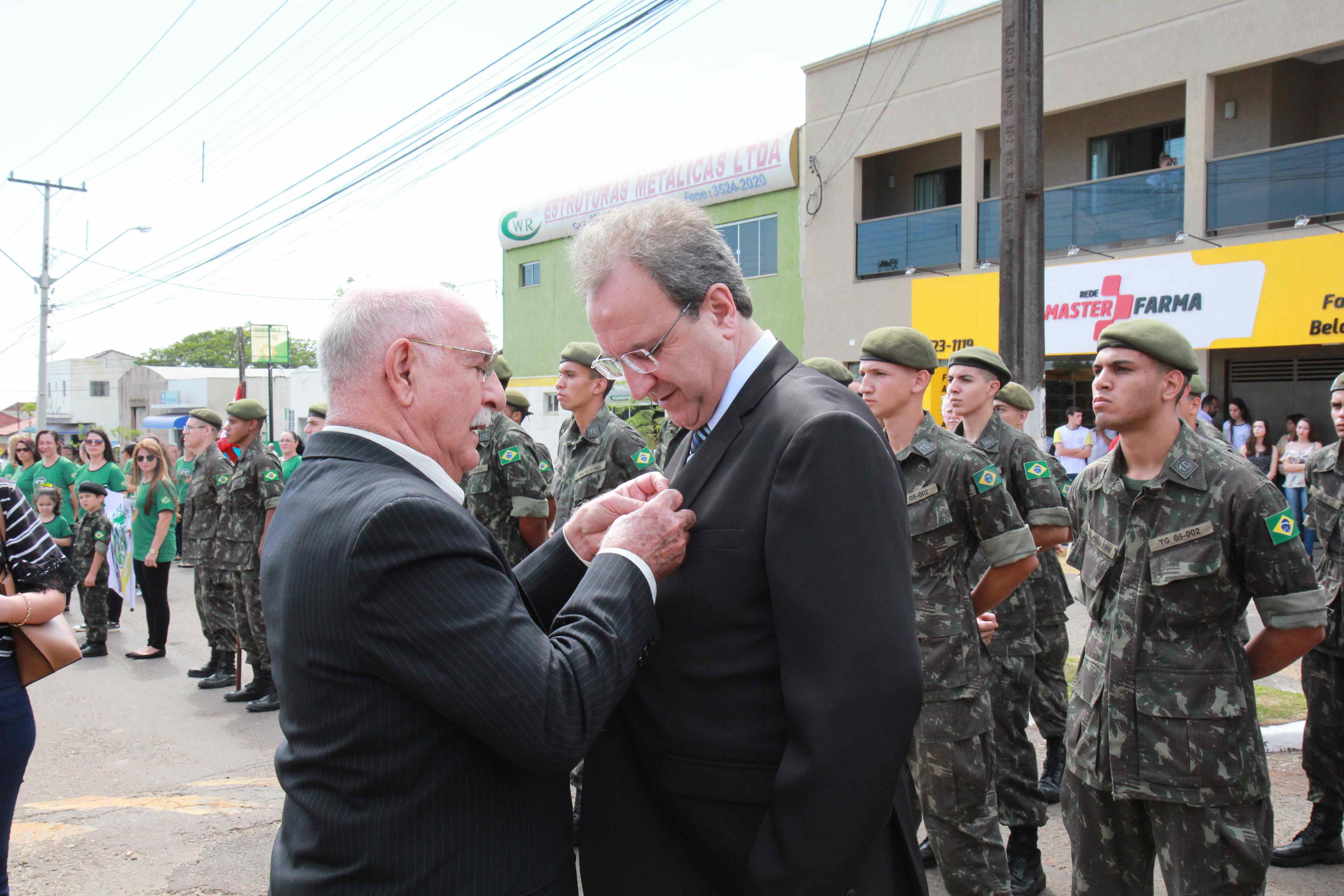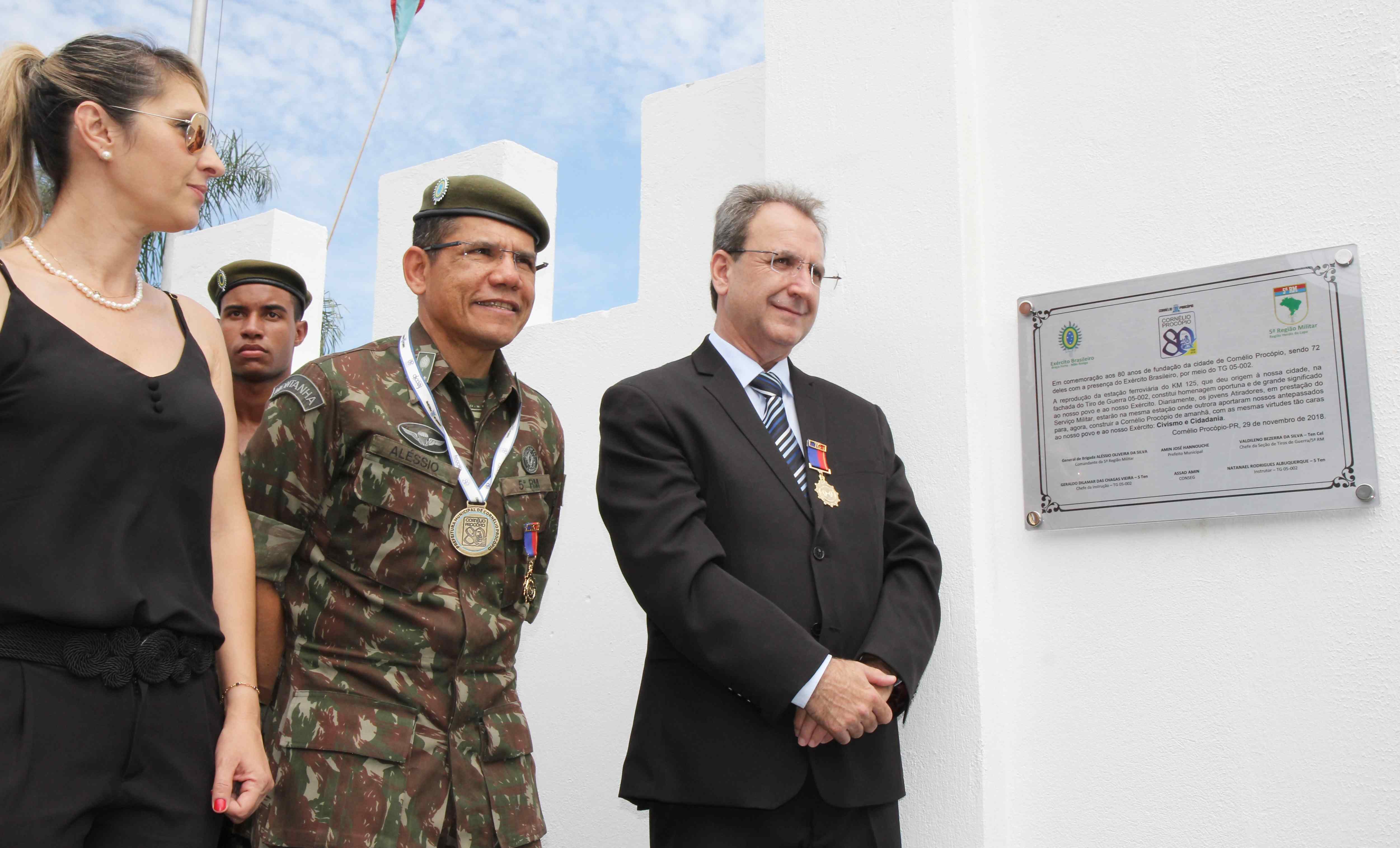 Durante a solenidade de inauguração da nova fachada do TG, foi entregue a “Medalha Mérito do Tiro de Guerra”, criada em comemoração aos 105 anos da criação do primeiro Tiro de Guerra do Brasil, na cidade de Rio Grande, no estado do Rio Grande do Sul, com a fundação de uma sociedade de tiro ao alvo com finalidades militares. De acordo com o Exército Brasileiro, esta honraria é outorgada pela Academia de Estudos de Assuntos Históricos, organização sem fins lucrativos que, em parceria com as prefeituras municipais e após indicação das Seções de Tiros de Guerra das Regiões Militares, agraciam Militares e Civis que tenham, por abnegação, dedicação e capacidade profissional, contribuído para desenvolver os valores espirituais e morais da nacionalidade e o sentimento das obrigações para com a pátria, contribuindo para fortalecer a cidadania. Foram homenageados o General de Brigada Aléssio Oliveira da Silva, o prefeito Amin Hannouche, o soldado Rubervaldo Felisberto Angelo, o empresário e agropecuarista Wilson Roberto da Costa e a professora Neuza Fuin. O General Aléssio Oliveira da Silva destacou que a unidade militar procopense atende a todas as exigências do Exército Brasileiro. Ele agradeceu as homenagens que recebeu da comunidade e parabenizou o município pelos 80 anos. O Chefe de Instrução do TG, Geraldo Dilamar das Chagas Vieira, Chefe de Instrução fez um breve histórico do Tiro de Guerra e parabenizou todos os envolvidos neste projeto que homenageou Cornélio Procópio. O prefeito Amin Hannouche, Diretor Geral do Tiro de Guerra 05/002 agradeceu a homenagem que recebem e parabenizou os instrutores do TG pela iniciativa de construir uma nova fachada que retrata a primeira estação ferroviária do município. “Nossos profundos agradecimentos, em nome da comunidade procopense, ao Exército Brasileiro por este reconhecimento e pela presença em nossa cidade nestes 72 anos. Esta parceria foi e continuará sendo muito importante para nossa cidade, que este ano comemora seus 80 anos”, concluiu o prefeito. Participaram da solenidade o vereador Diones Carlos de Campos, representando a Câmara Municipal de Vereadores, o prefeito de Santa Mariana, Jorge Nunes, o Coronel Luiz Roberto Costa, Comandante do 2º Comando Regional de Polícia Militar de Londrina, o Tenente Coronel Wilton Carlos Sanches Lima, Adjunto da Seção de Tiros de Guerra da 5ª Região Militar, o Tenente Coronel Wilton Carlos Sanches Lima, Adjunto da Seção de Tiros de Guerra da 5ª Região Militar, o Tenente Coronel Hilberaldi Correia de Lima, Comandante do 18º Batalhão de Polícia Militar de Cornélio Procópio, Major Welington Nunes Moreira, Subcomandante do 18º Batalhão de Polícia Militar, o Major Jeferson Agenor Busnello, Comandante da 2ª Companhia de Polícia Militar em Bandeirantes, o Major Edvaldo Isidoro Vieira, Diretor Comandante do 3º Colégio da Polícia Militar em Cornélio Procópio, a representação do Bombeiro Mirim, empresários e representações sociais e educacionais. (Comunicação/Prefeitura)