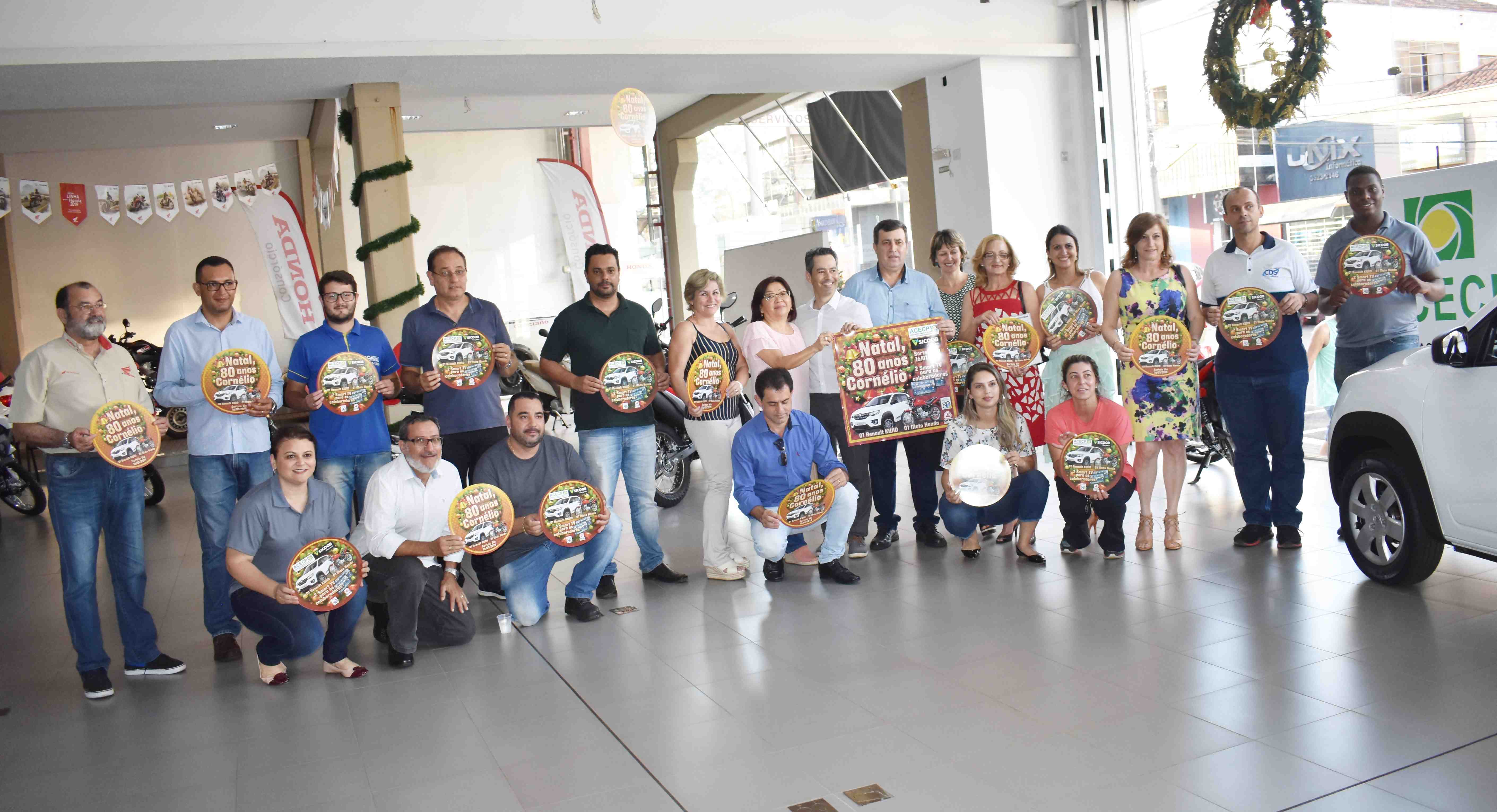Cornélio Procópio – Comerciantes filiados à Associação Comercial e Empresarial estão otimistas em relação á Campanha Natal 80 Anos de Cornélio Procópio, lançada esta semana nas dependências da Honda Graciano. Os empresários convidados retiraram os cupons para presentear seus consumidores com a possibilidade de ganharem 01 veículo Renault Kwid e uma Moto Honda 0 km. Os funcionários e colaboradores também receberão cupons para concorrer a TVs Smart 32”. Segundo o presidente da ACECP, Fabiano Inoue, este ano, a entidade vai sortear um carro e uma moto aos consumidores que fizerem suas compras nas lojas conveniadas, que serão identificadas com um banner da ACECP. Ele destacou ainda a parceria com a prefeitura de Cornélio Procópio na campanha deste ano. “O Natal é uma festa de toda a comunidade, por isso a parceria com a prefeitura tem sido muito positiva sob todos os aspectos. A cidade está bonita e deverá receber todos os consumidores locais e da região, com muito carinho e dedicação”, disse Fabiano Inoue. O Secretário de Desenvolvimento Urbano de Cornélio Procópio, Celso Marin representou o prefeito Amin Hannouche no lançamento da Campanha de Natal deste ano. Conforme Marin, o prefeito também está otimista em relação às vendas que normalmente aquecem o comércio local. “Nossa participação vem somar com a Associação Comercial e Empresarial na promoção e realização de mais esta campanha que já começou vitoriosa”, concluiu Celso Marin. (Comunicação/Prefeitura)