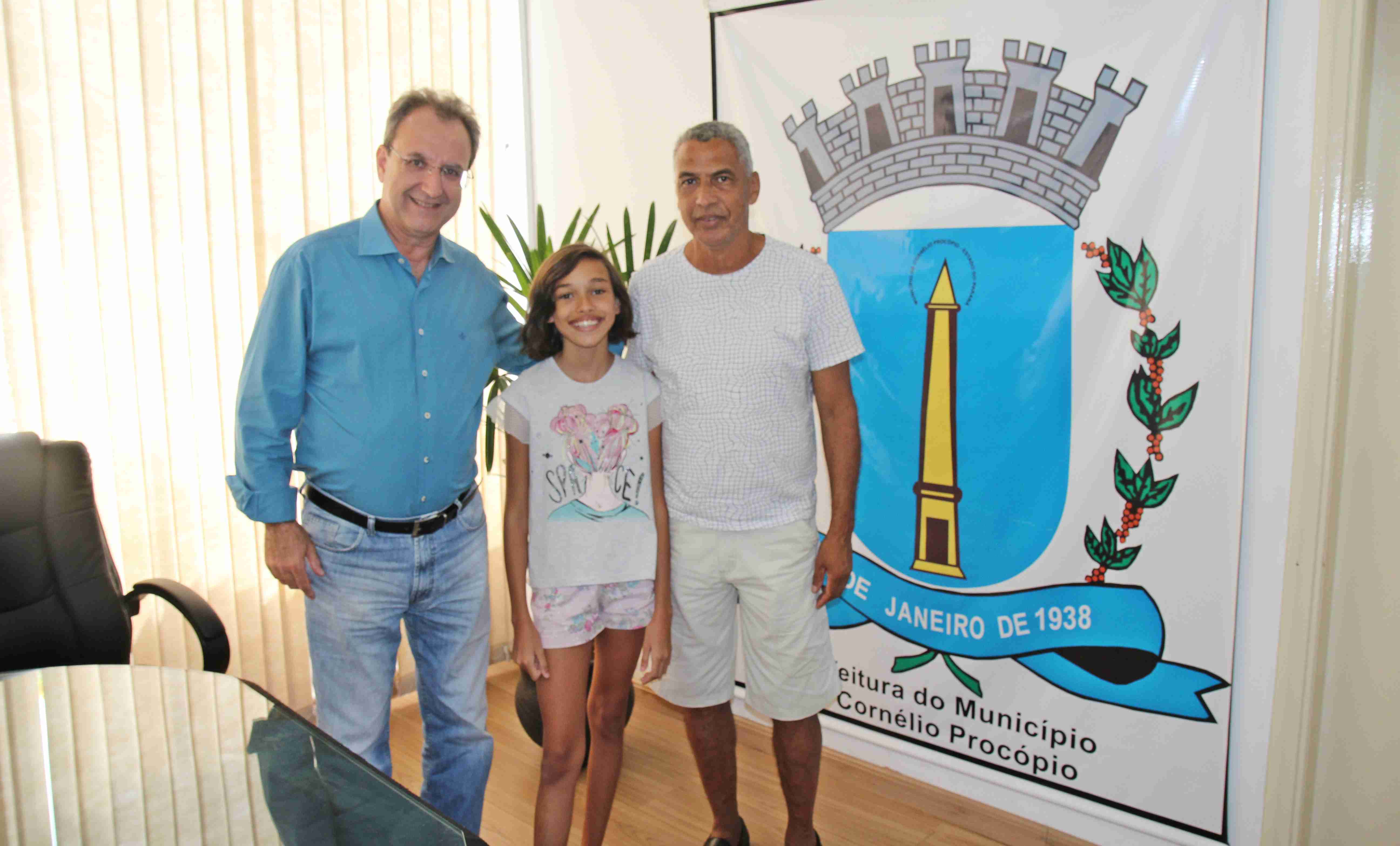 Cornélio Procópio – “Em nome de todos os Procopenses, quero expressar aqui, a gratidão e os parabéns de toda nossa comunidade pela maneira como você representou nossa cidade neste programa que é visto por todo o Brasil”. Esta saudação foi feita à cantora Luiza Ênale Dantas Aguiar, a Luê Aguiar, pelo prefeito Amin Hannouche. Ela, que na edição do último domingo do programa The Voice Kids, da Rede Globo, interpretou de maneira fantástica, a música Leãozinho, clássico da MPB – Musica Popular Brasileira que foi composta por Caetano Veloso. Luê Aguiar conseguiu conquistar de forma unanime os jurados competentes e rigorosos Carlinhos Brown, Simone e Simaria e Claudinha Leite. Segundo o prefeito Amin Hannouche, sua interpretação superou as expectativas não apenas dos jurados, mas também de toda a nossa cidade, nossa região e o país, que vibrou com sua classificação. “Todos nós ficamos muito felizes com a participação da Luê no programa e estamos muito animados para continuar torcendo para que ela vença esta competição, que atrai a atenção de todo o País”, afirmou o prefeito. Luê Aguiar e seu Pai, o músico e professor Carlos Aguiar foram recebidos pelo prefeito na tarde desta segunda-feira no gabinete oficial. Amin Hannouche destacou ainda que a torcida na cidade foi incrível. “Imediatamente milhares de pessoas se manifestaram nas redes sociais parabenizando a nossa cantora pré-adolescente. Ela demonstrou firmeza e muito profissionalismo”, disse o prefeito. Um dos momentos mais emocionantes foi quando Luê Aguiar escolheu a cantora Baiana Claudia Leite para a ser a sua madrinha e instrutora a partir desta semana. Nesta terça-feira ela terá a oportunidade de se apresentar para toda a comunidade procopense, na Feira da Lua, na Praça Botafogo, no centro da cidade, quando será homenageada. Participa desta homenagem a Miss Cornélio, a Jornalista Náthaly Baraldi, que no próximo dia 5 de fevereiro participa do Concurso Miss Paraná, em Curitiba, representando Cornélio Procópio neste evento que será visto por todos os paranaenses. (Comunicação/Prefeitura)
