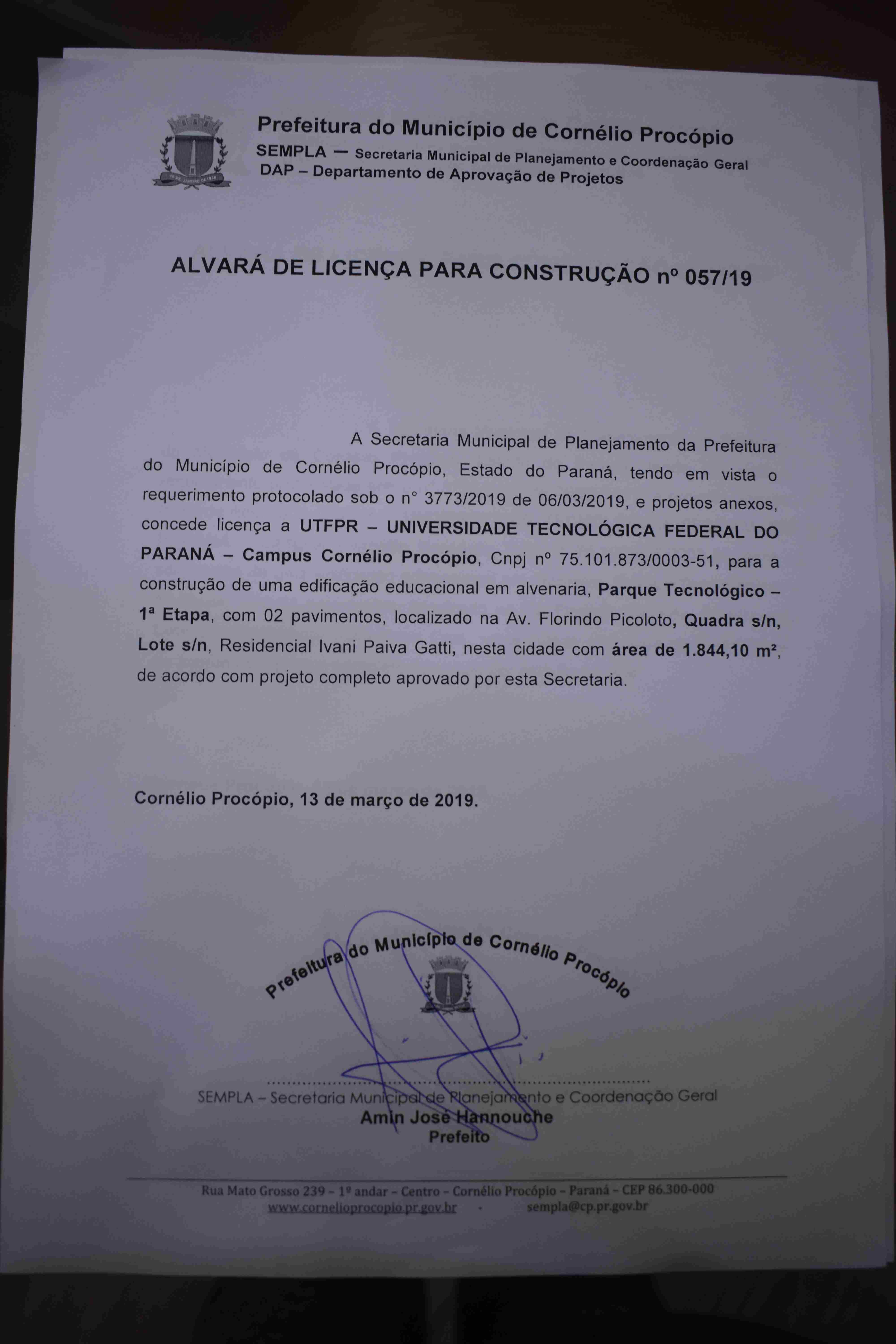 Cornélio Procópio- O prefeito Amin Hannouche reuniu-se com o Diretor da Universidade Tecnológica Federal do Paraná (UTFPR), Professor Marcos Jacometti, para assinar a documentação necessária para o início das obras do Parque Tecnológico da Universidade em nosso município. O parque será localizado na Avenida Florindo Picoloto, imediações com o Jardim Panorama no início da cidade. O Diretor da instituição, Marcos Jacometti, mostrou-se entusiasmado com a criação do Parque Tecnológico. Para ele, a criação do Parque representa um salto gigantesco rumo ao desenvolvimento, onde toda a cidade sentirá os efeitos positivos da iniciativa. “A cidade ganha um verdadeiro presente. Agora é a hora de tornar esta enorme conquista em realidade em menor tempo possível”, destacou o diretor. O prefeito Amin Hannouche ressaltou a importância do Parque Tecnológico, projetando que a área será um grande polo para o desenvolvimento intelectual da população procopense. “Estamos concretizando uma ação efetiva que vai transformar a realidade da cidade, proporcionando novas perspectivas de desenvolvimento humano e tecnológico para a população. E Cornélio firmando-se como polo educacional”, completou o prefeito Amin. (Comunicação/Prefeitura)