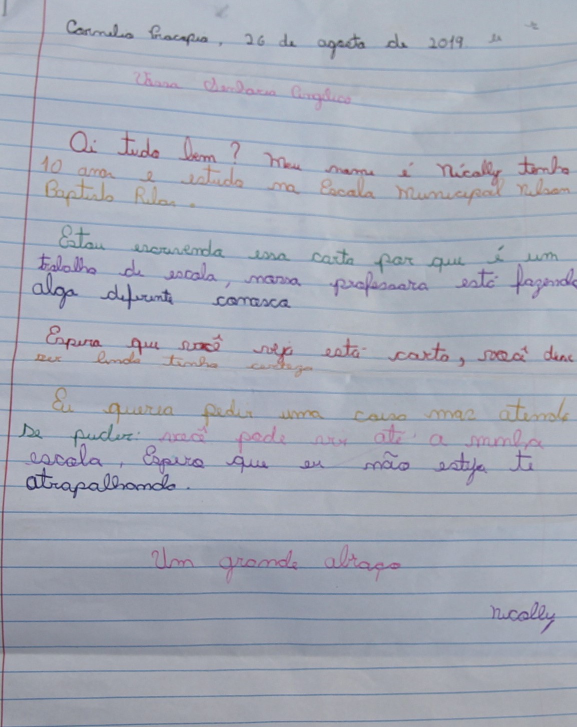 A Escola Municipal Nilson Baptista Ribas, localizada na Vila Popular, viveu um momento especial e que chamou a atenção dos professores e funcionários. Nesta segunda-feira (09) o a vice-prefeita Angélica Olchaneski esteve na escola para conhecer o projeto de envio de cartas, como era feito antes das plataformas digitais, ou seja, escrito numa folha de papel e remetida até a pessoa endereçada. A comoção foi da aluna do 5º ano Nicolly, que escreveu uma carta para a vice-prefeita, e se emocionou com a presença de Angélica, que foi pessoalmente à escola para responder a cartinha. O registro mostra que o calor humano prevalece e que o bom relacionamento é fundamental. A iniciativa foi da professora Juliana Simabucuro e da diretora Drenice Raquel Dynczuki Ramos.“Atitudes simples com desdobramentos de muito carinho, amor e respeito fazem com que a vida pública nos ensine a cada dia o verdadeiro sentido que temos em relação a um ato tão sublime como este” garantiu a vice-prefeita Angélica.