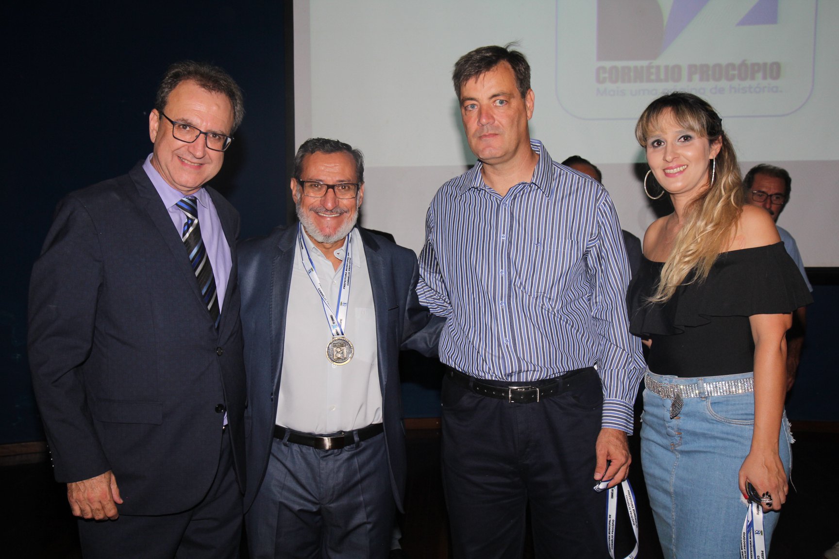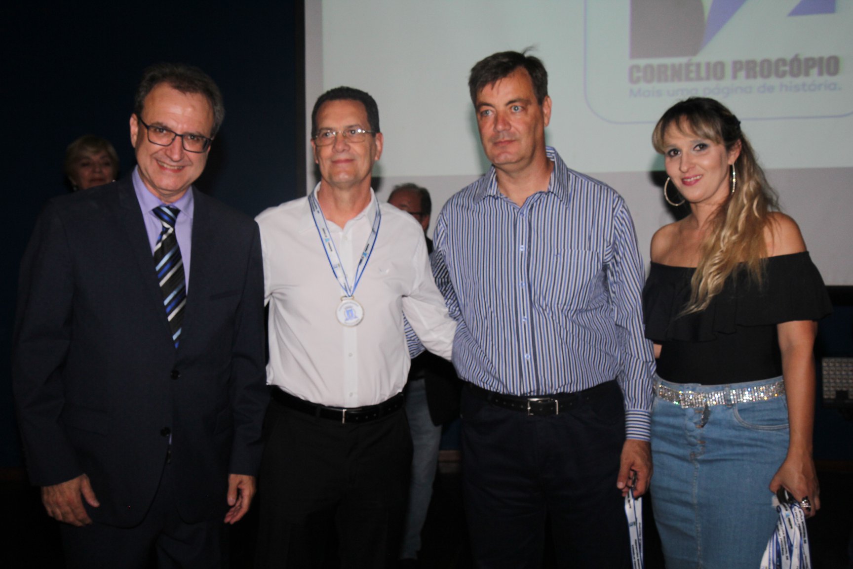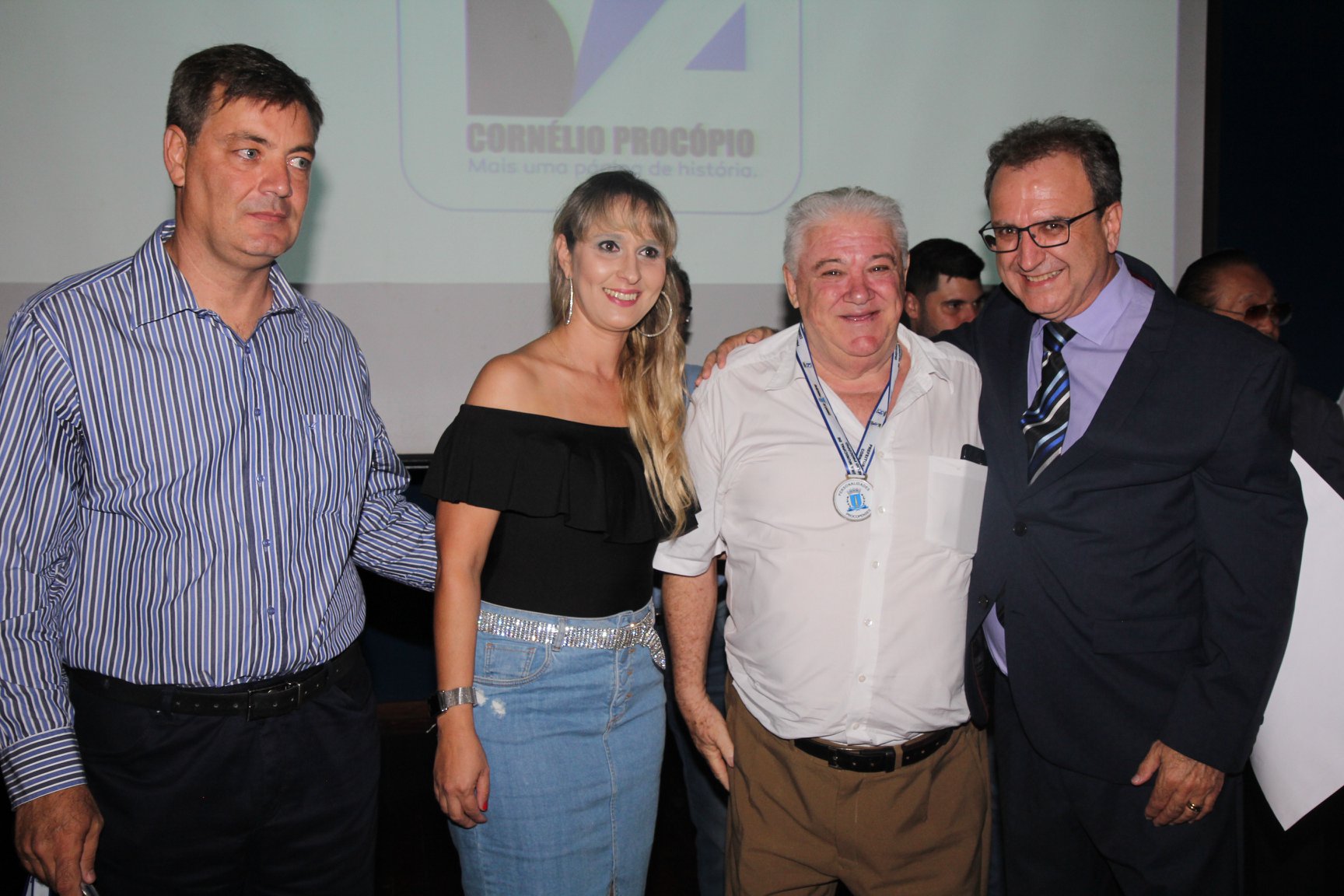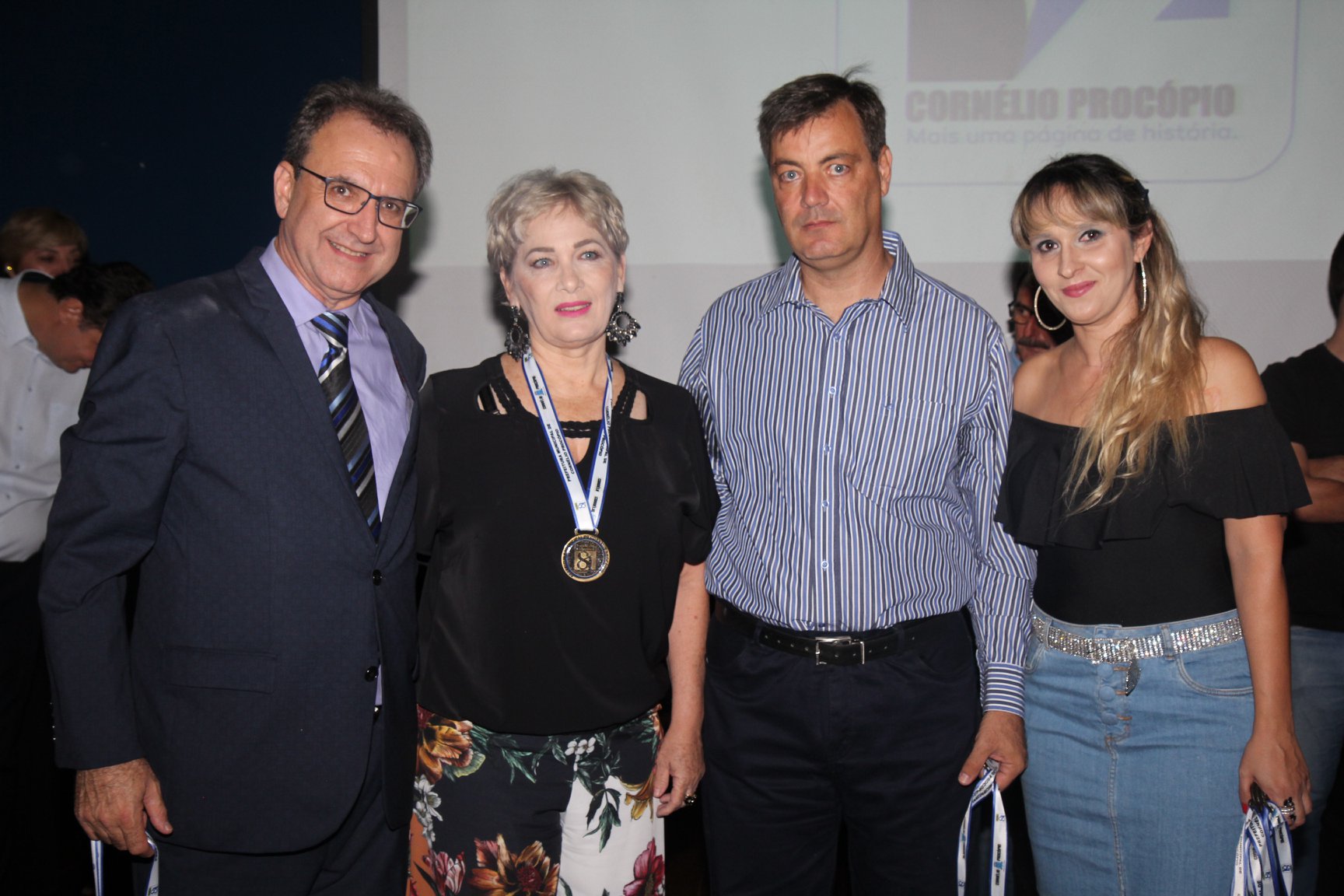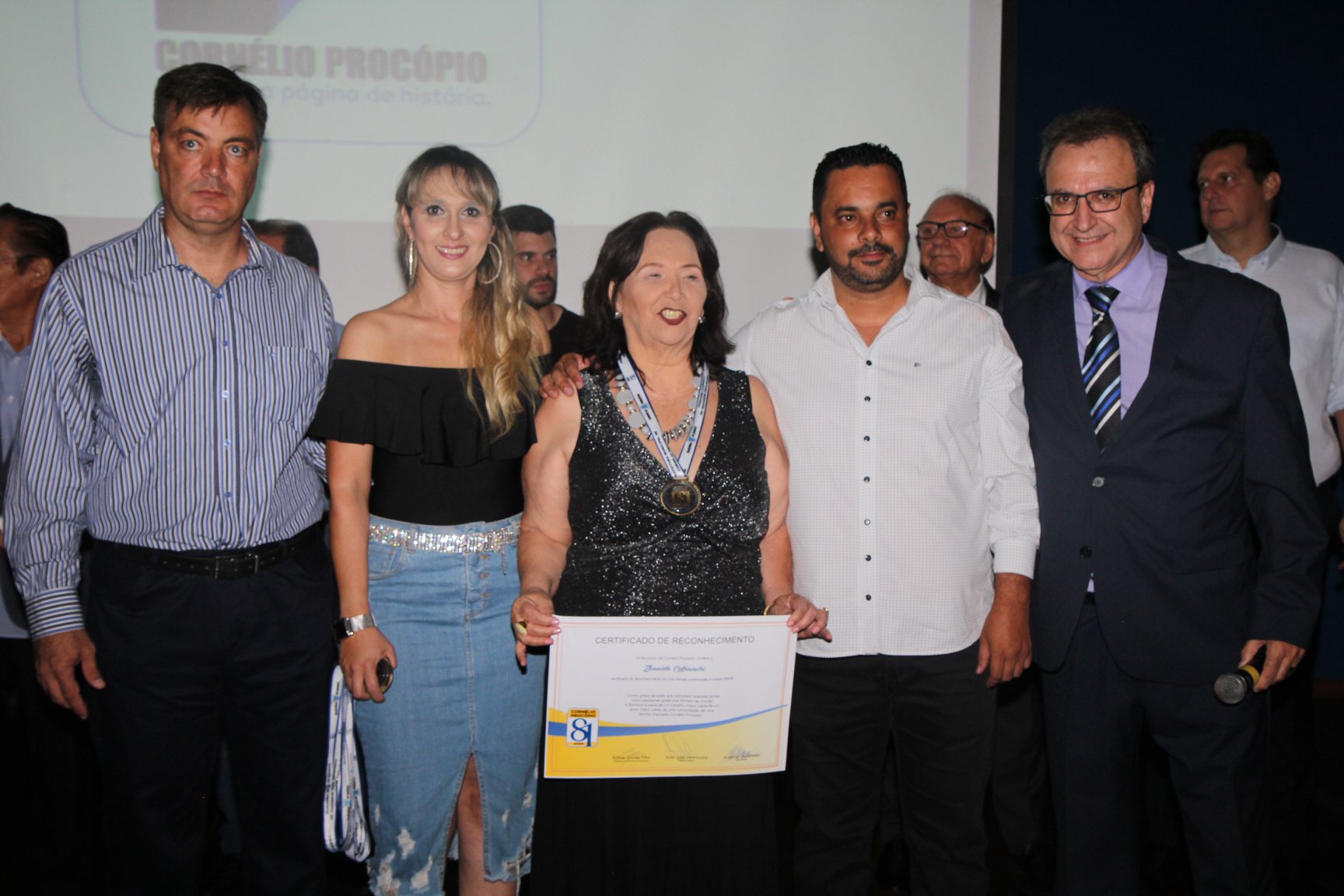 Cornélio Procópio – Pelo segundo ano consecutivo, a programação de aniversário de Cornélio Procópio premiou procopenses que se destacaram ao longo dos últimos anos. O evento marca o encerramento da programação dos 81 anos e é realizado sempre no dia 14 de fevereiro. O anfiteatro da Universidade Tecnológica Federal do Paraná, UTFPR ficou pequeno para receber os homenageados e seus familiares. Os convidados foram recebidos com apresentações musicais da Banda Santa Cecília. O poeta João Anastácio declamou poesias e o Coral Cristo Rei encerrou a programação. Para o prefeito Amin Hannouche, as homenagens emocionaram os convidados deste ano. “Nosso reconhecimento ao trabalho e a dedicação de todos estes procopenses no desenvolvimento de nossa cidade ao longo destes anos”, afirmou. Ao lado do presidente da Câmara, Edmar Gomes, da Vice-prefeita Angélica Olchaneski e outras autoridades, o prefeito Amin Hannouche entregou dezenas de Medalhas e Certificados aos homenageados. A benção ecumênica foi presidida pelo Bispo Diocesano, Dom Manoel Francisco e pelo Pastor Carlos Roberto Fernandes. Os homenageados foram representados pela professora Dina Brito e pelo poeta Gilberto Mensato.