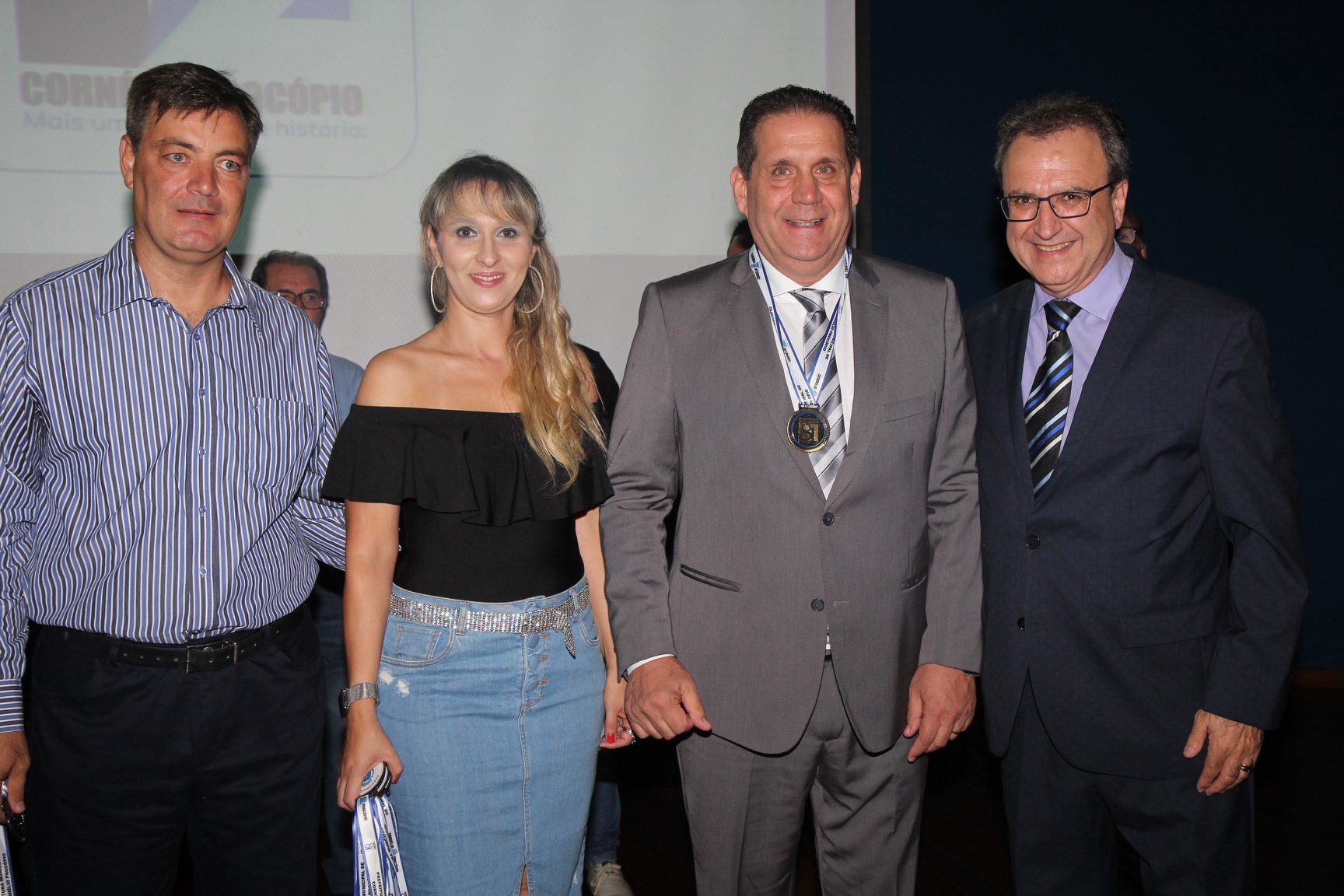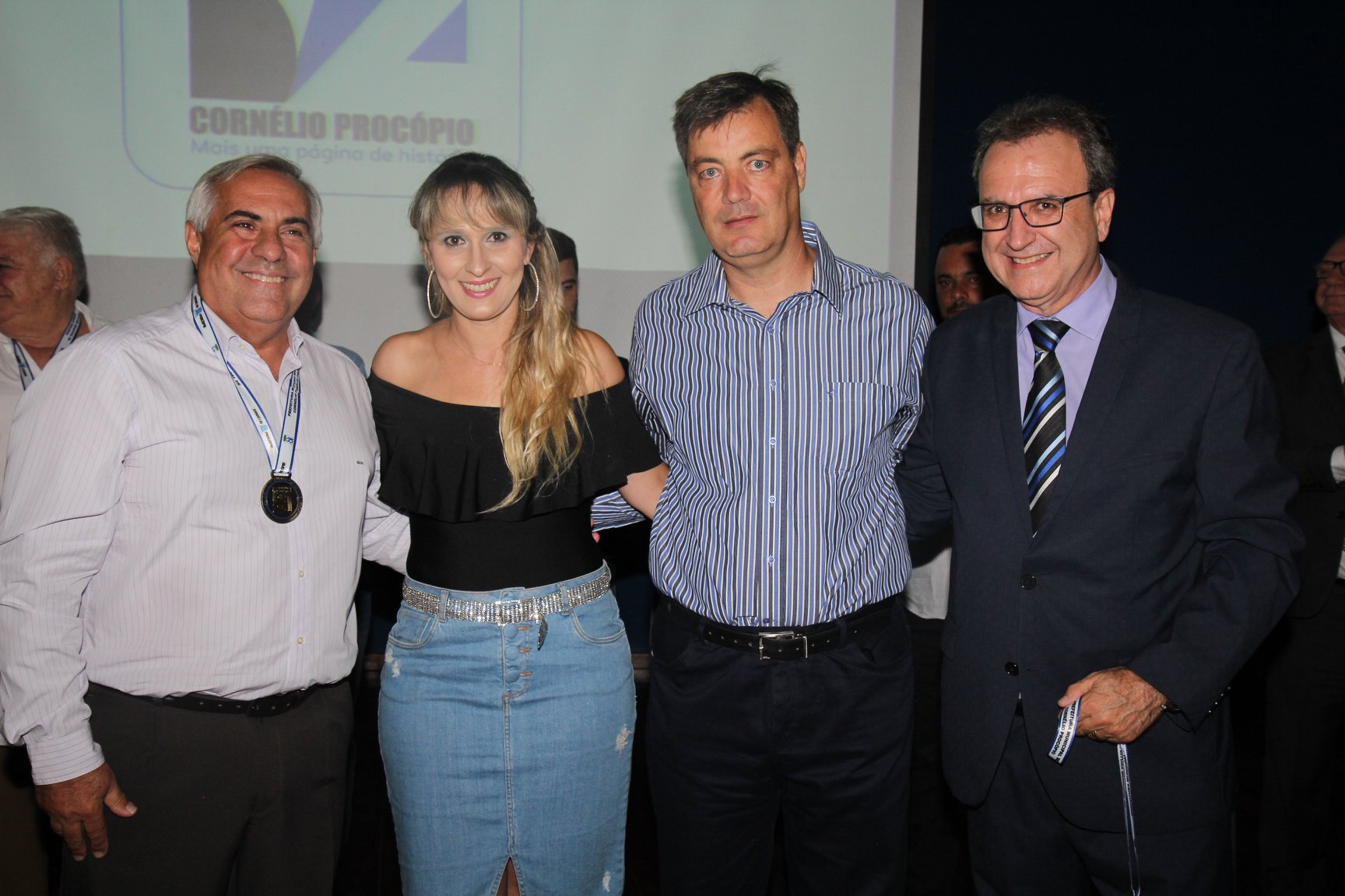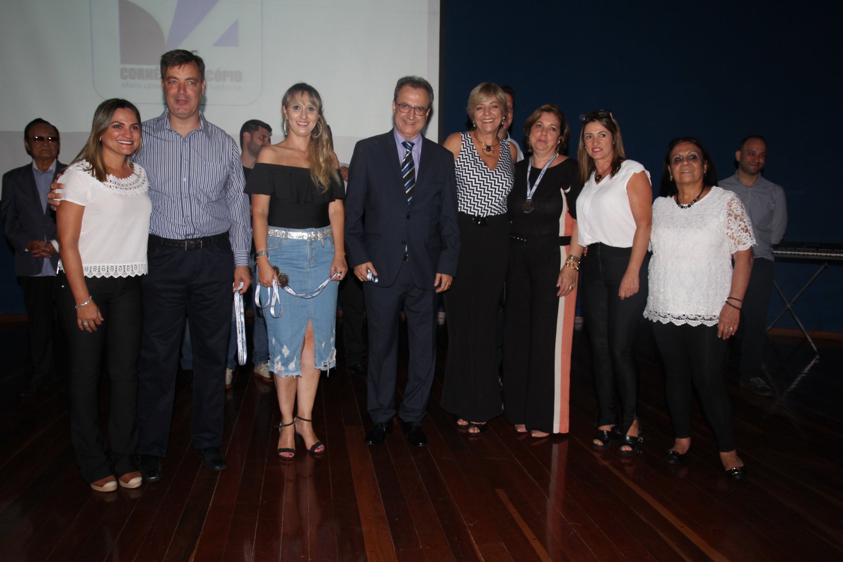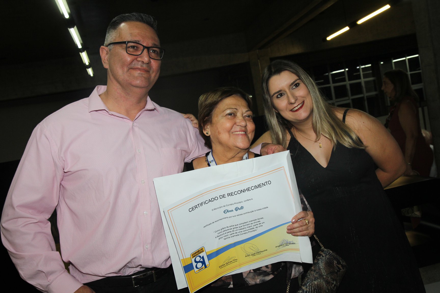 Cornélio Procópio – Pelo segundo ano consecutivo, a programação de aniversário de Cornélio Procópio premiou procopenses que se destacaram ao longo dos últimos anos. O evento marca o encerramento da programação dos 81 anos e é realizado sempre no dia 14 de fevereiro. O anfiteatro da Universidade Tecnológica Federal do Paraná, UTFPR ficou pequeno para receber os homenageados e seus familiares. Os convidados foram recebidos com apresentações musicais da Banda Santa Cecília. O poeta João Anastácio declamou poesias e o Coral Cristo Rei encerrou a programação. Para o prefeito Amin Hannouche, as homenagens emocionaram os convidados deste ano. “Nosso reconhecimento ao trabalho e a dedicação de todos estes procopenses no desenvolvimento de nossa cidade ao longo destes anos”, afirmou. Ao lado do presidente da Câmara, Edmar Gomes, da Vice-prefeita Angélica Olchaneski e outras autoridades, o prefeito Amin Hannouche entregou dezenas de Medalhas e Certificados aos homenageados. A benção ecumênica foi presidida pelo Bispo Diocesano, Dom Manoel Francisco e pelo Pastor Carlos Roberto Fernandes. Os homenageados foram representados pela professora Dina Brito e pelo poeta Gilberto Mensato.
