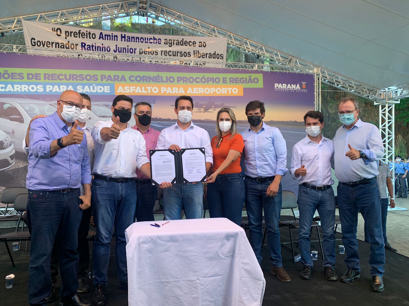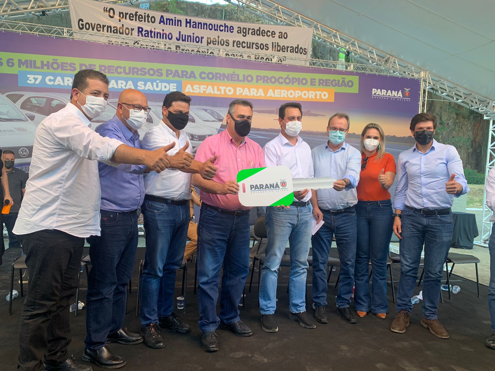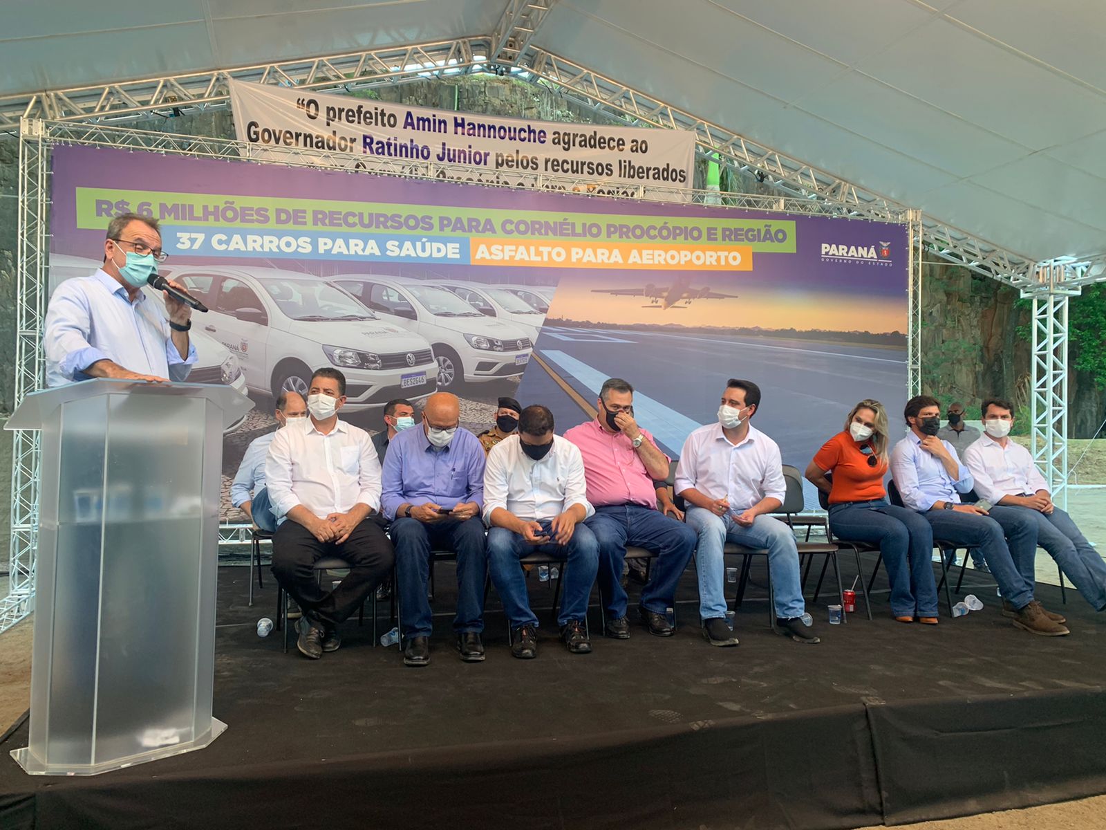 O governador Carlos Massa Ratinho Junior anunciou na tarde desta quarta-feira (03) em Cornélio Procópio, a liberação de aproximadamente R$ 19 milhões para o Hospital Regional, em fase de conclusão no município. Recepcionado pelo prefeito Amin Hannouche, veio ao município para entrega de uniformes para o Colégio Cívico-Militar Monteiro Lobato; 37 veículos para secretarias municipais da Saúde da 18ª Regional da Saúde e a liberação de R$ 4.771.057,10 para a recuperação asfáltica e o balizamento noturno do aeroporto Francisco Lacerda Junior.