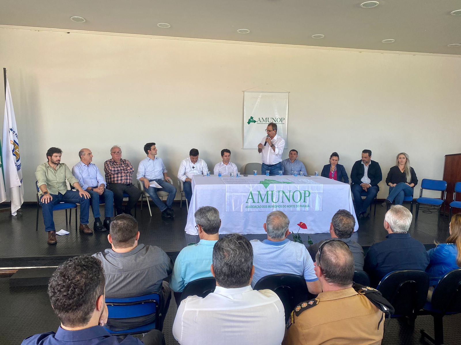 Reunião de trabalho da Associação dos Municípios do Norte do Paraná (Amunop) recebeu na tarde de quinta-feira (18), no anfiteatro da Uenp (Universidade Estadual do Norte do Paraná), os secretários estaduais, Sandro Alex, de Infraestrutura e Logística e Eduardo Pimentel, das Cidades. Oportunamente o prefeito de Cornélio Procópio e presidente da Amunop, Amin José Hannouche, abordou temas importantes para Cornélio e região. Sede local do IML e curso de medicina foram colocados em pauta. Em pronunciamento, Sandro Alex falou sobre o curso de medicina. Ele enalteceu estudo já realizado para custeio do curso e garantiu a disponibilização dos recursos necessários para a implantação da graduação na região. “A implantação do curso de medicina vai além da necessidade de recursos, estamos tratando de questões políticas e administrativas, pois a ordem financeira para este custeio está garantida, digo isso como representante dos municípios da Amunop”, garantiu Alex.