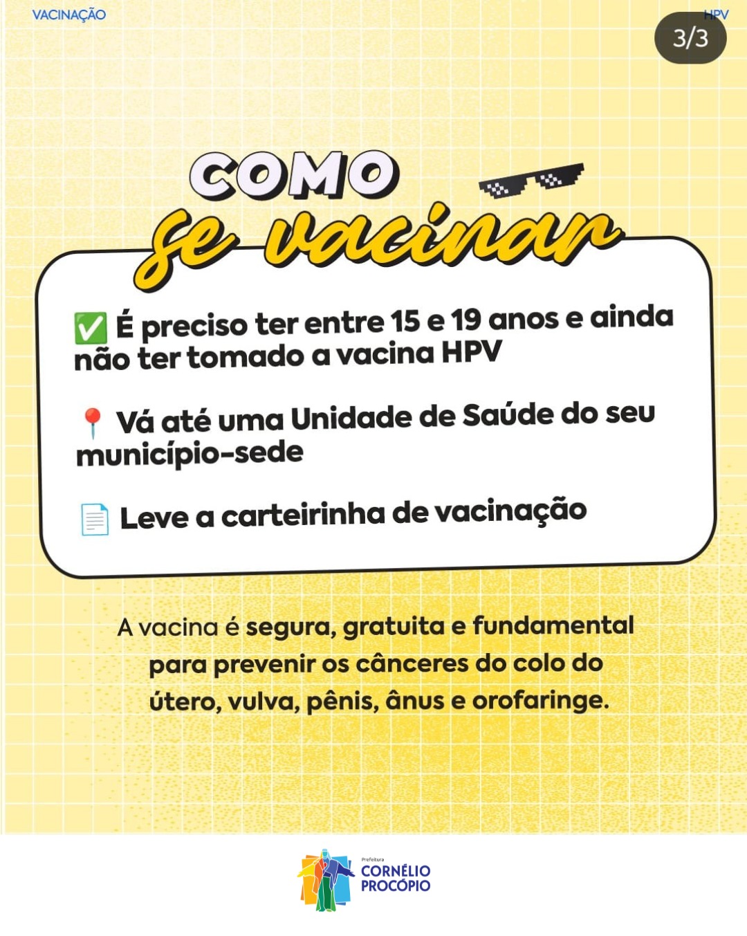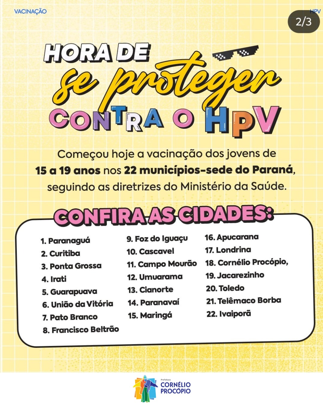 A campanha de vacinação contra o HPV para jovens de 15 a 19 anos já está em andamento em 22 municípios do Paraná, incluindo Cornélio Procópio. Para se vacinar, basta ir até uma Unidade Básica de Saúde do município levando a carteirinha de vacinação.