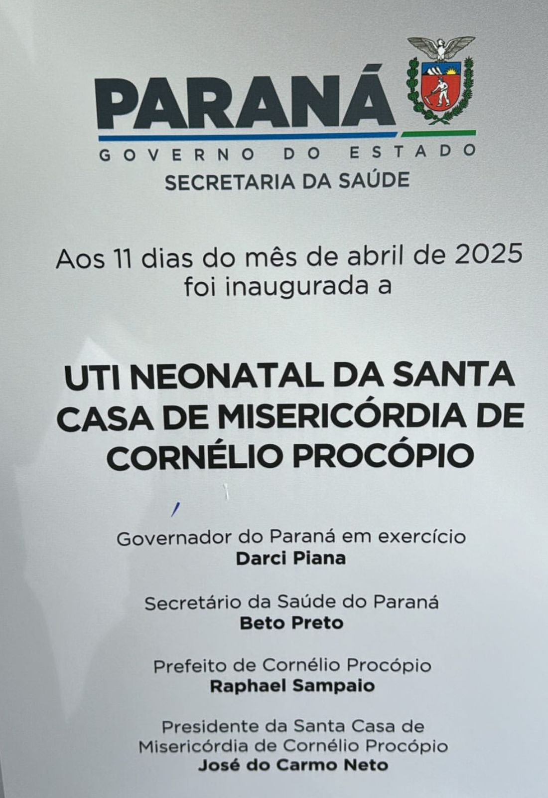 Nesta sexta-feira, o governo do Estado do Paraná, em parceria com a Prefeitura de Cornélio Procópio, inaugurou a Unidade de Terapia Intensiva (UTI) Neonatal da Santa Casa. A nova unidade conta com 10 leitos totalmente equipados para atender recém-nascidos de 21 municípios da 18ª Regional de Saúde. O investimento totalizou R$ 1,7 milhão, proveniente da Secretaria de Estado da Saúde, e abrange reformas estruturais e a aquisição de equipamentos hospitalares.