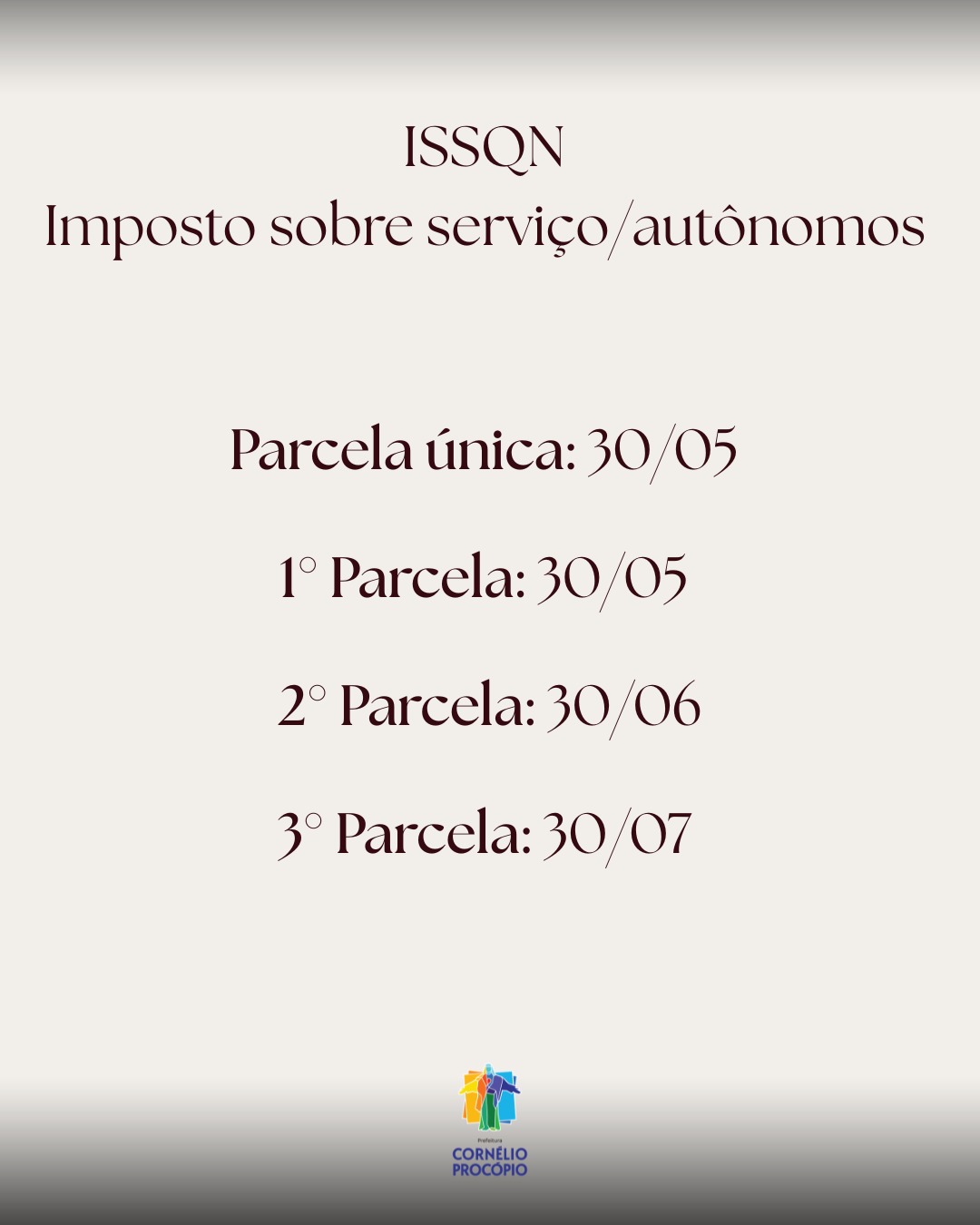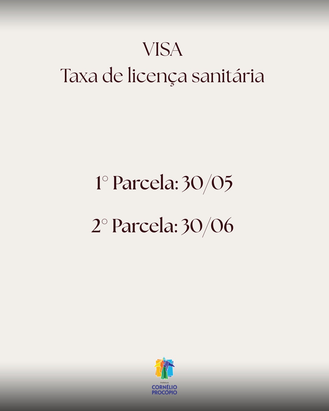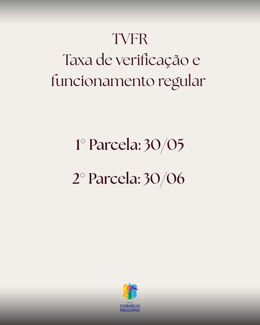A Prefeitura de Cornélio Procópio também definiu as datas para o pagamento da TVFR (Taxa de Verificação e Funcionamento Regular) e da VISA (Taxa de Licença Sanitária). A primeira parcela dessas taxas também vence no dia 30. A TVFR e a VISA devem ser pagas por todos os prestadores de serviços e comerciantes da cidade, exceto microempreendedores individuais (MEI).