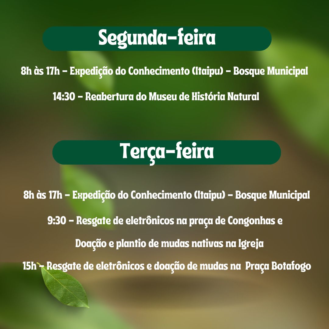 Na terça-feira (4/6), a Praça Botafogo será palco de ações abertas à população, com doação de mudas. No distrito de Congonhas, a programação inclui resgate de eletrônicos, plantio e doação de mudas, além de brinquedos para o público infantil.