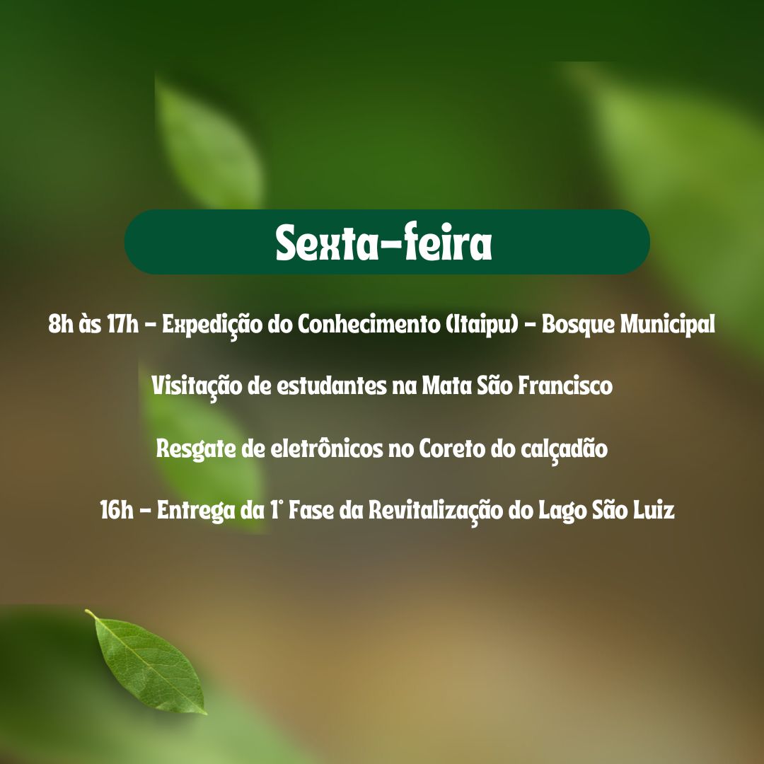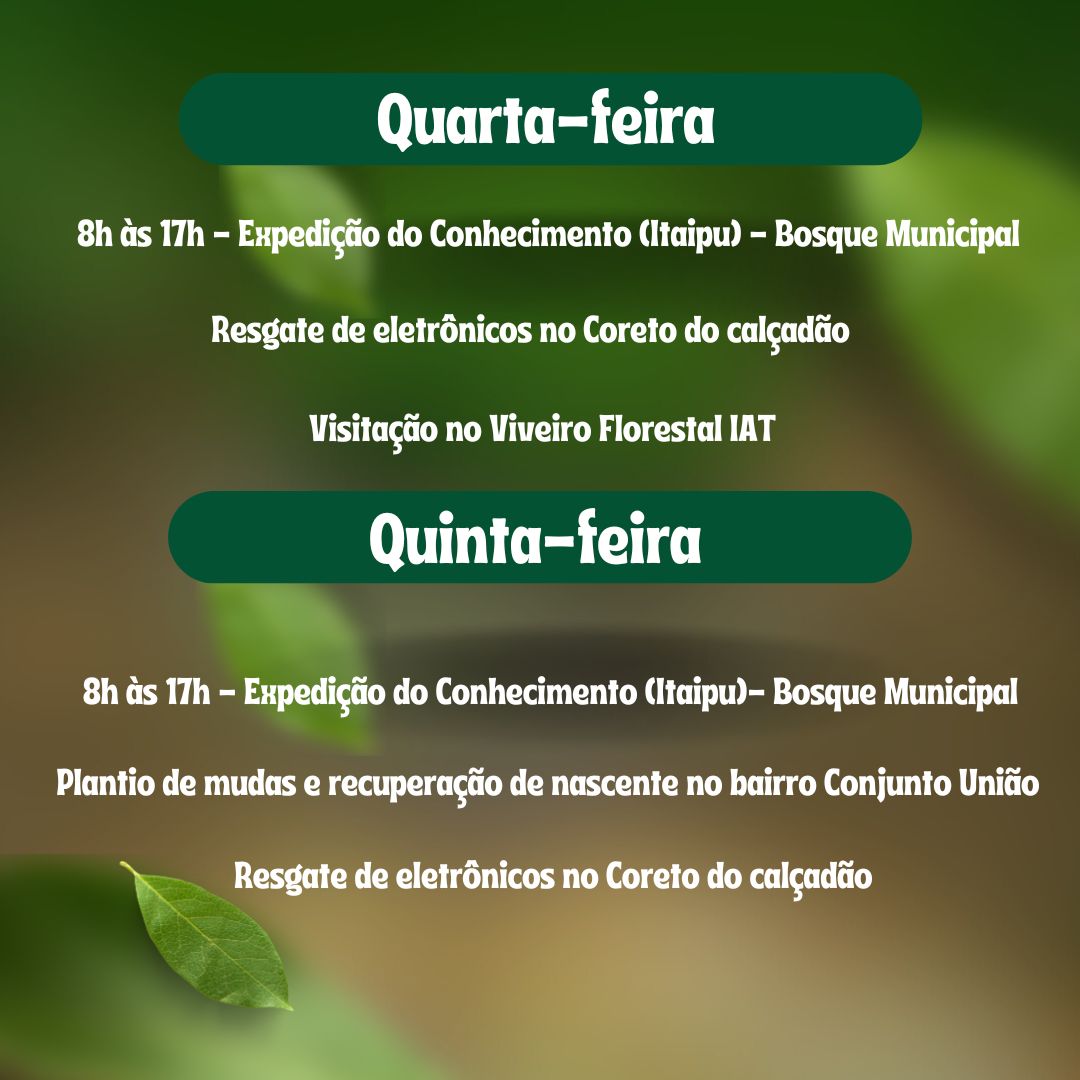 Ao longo da semana, o Bosque Municipal estará aberto à visitação das 8h às 17h. A população poderá aproveitar o espaço para passeios e contato com a natureza. Ali, também estará a Expedição do Conhecimento, uma experiência interativa sobre temas ligados ao meio ambiente. O projeto é uma iniciativa da Itaipu e do Governo Federal.