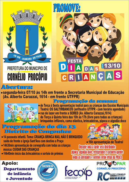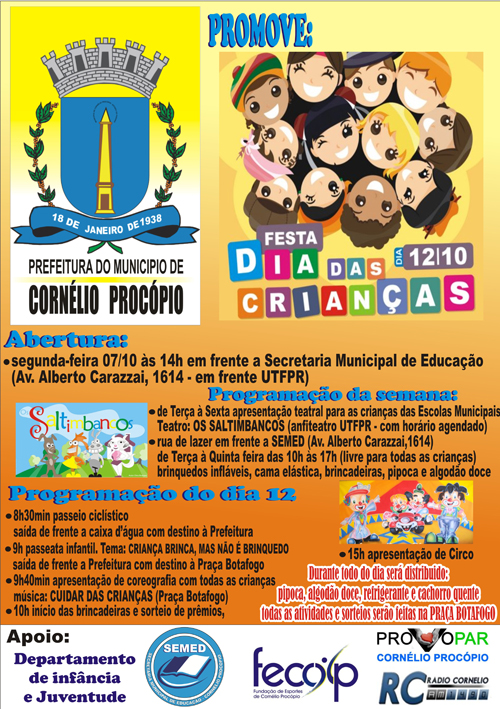 A promoção da Associação Comercial e Empresarial de Cornélio Procópio (ACECP) conta com o apoio da Prefeitura do Município e está promovendo a "Semana do Consumidor – Mês das Crianças" com o comércio oferecendo promoções especiais neste período. A promoção no comércio teve início no sábado passado, dia 05, quando as lojas do comércio atenderam das 9h às 17h.