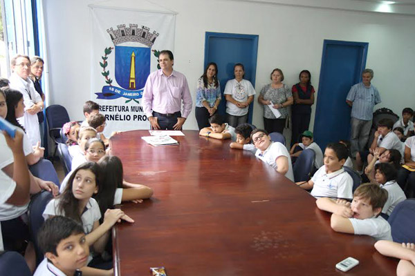 O prefeito de Cornélio Procópio, Fred Alves (PSC), recebeu na manhã desta sexta-feira, dia 21, a visita de quase cem alunos da Escola Rui Barbosa. Os alunos vieram à prefeitura conhecer a estrutura de funcionamento e conversar com o chefe do executivo. A oportunidade para o prefeito foi oportuna para responder questionamentos dos estudantes que se demonstraram interessados por assuntos de bem público. As principais questões abordadas pelos alunos foram à condição da cidade em receber o curso de medicina, e a importância das rampas de acessibilidade que estão sendo construídas na cidade.