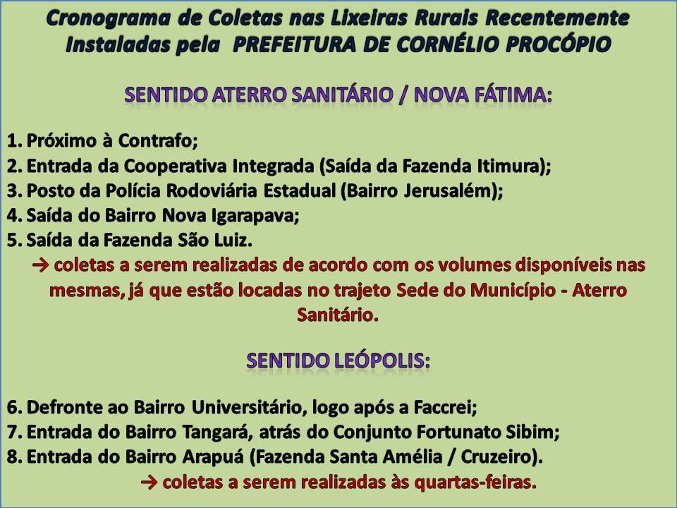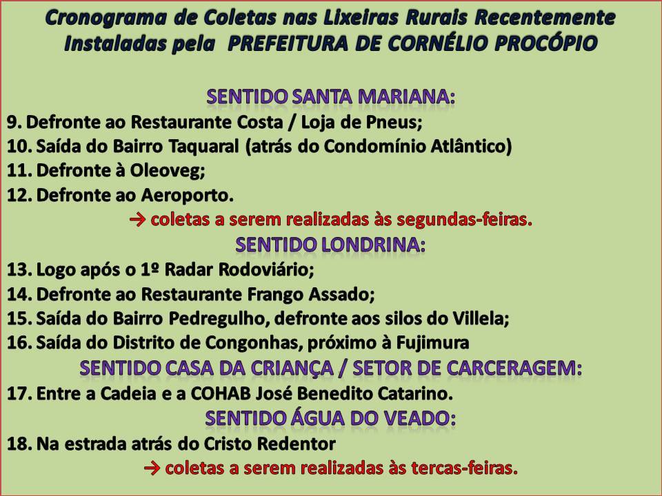 A prefeitura já realizou a instalação de lixeiras em diversos pontos de estradas rurais que pertencem ao município de Cornélio Procópio. A instalação destes coletores era uma reivindicação dos produtores rurais que tiveram seu pedido atendido pelo prefeito Fred Alves (PSC). “Pedimos atenção aos produtores para que depositem nas lixeiras apenas os lixos recicláveis para que estes possam ter uma destinação correta”, lembrou o prefeito Fred.