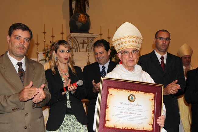 Esta semana, dom Getúlio Guimarães continuou visitando as paróquias da diocese para se despedir da comunidade católica da região. Em Cornélio Procópio ele presidiu uma missa em Ação de Graças e recebeu uma homenagem da Câmara Municipal de Vereadores. A missa realizada na Catedral Cristo Rei contou com a presença de autoridades, convidados e dos padres que trabalham nas capelas das cidades que integram a diocese. Após a cerimônia religiosa, dom Getúlio Guimarães foi homenageado pelo Legislativo pelos relevantes serviços prestados à comunidade local e regional com uma “Moção de Aplauso”, aprovada por unanimidade. O Prefeito Fred Alves (PSC) destacou a atuação do chefe de Igreja Católica como exemplo a todos os homens e mulheres que foram consagrados na vida religiosa. "Dom Getúlio tem uma história de trabalho e dedicação que ultrapassou as fronteiras do nosso município e merece toda a homenagem da nossa comunidade", disse o prefeito.Dom Getúlio foi o terceiro bispo de Cornélio Procópio, desde a instalação da Diocese. Como já possui o título de Cidadão Honorário, entregue na década de 80, os vereadores desta legislatura decidiram homenageá-lo com uma Moção de Aplauso. A cerimônia de entrega do título foi realizada no altar da Catedral pelo presidente da Câmara, Edmar Gomes, com a presença de 10 dos 11 vereadores procopenses. Edmar Gomes ressaltou que a homenagem é justa e oportuna. “Como nosso bispo continuará vivendo em nossa comunidade, ele merece ser homenageado pela nossa sociedade e pelo povo procopense. Sua história de vida e dedicação é exemplo para todos nós. Dom Getúlio Guimarães é o exemplo vivo de dignidade, de amor pela igreja e pelos seus diocesanos. Que sua vida continue sendo abençoada”, afirmou o presidente da Câmara.