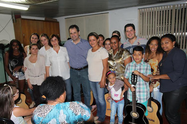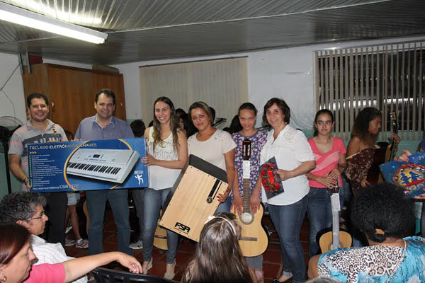 A apresentação foi na sede do CRAS e, além dos instrumentos, os usuários receberam uniformes, compostos de agasalhos, camisetas e bonés. O prefeito Fred assistiu as apresentações dos jovens e, antes da entrega dos materiais, falou sobre a importância em apoiar programas como este. Para ele, isto nada mais é do que investir no futuro desses adolescentes. “A nossa administração está se esforçando muito para estender a mão do governo municipal para as famílias que se preocupam com os seus filhos”, afirmou. E, dirigindo-se aos pais presentes, lançou um desafio. “Quero firmar aqui um compromisso: quanto mais vocês incentivarem seus filhos, muito mais projetos que, como prefeito, vou apoiar e disponibilizar recursos”, desafiou. O programa atende em média 120 crianças e adolescentes, com idades entre 11 e 17 anos, além de idosas e mães com filhos de zero a seis anos, com a oferta de oficinas de dança, iniciação em música e teatro, artesanato, esporte e laser, meio ambiente, orientação educacional além do acompanhamento com orientadores, assistentes sociais e psicólogos, tendo em vista o fortalecimento de vínculos familiares. Antes das apresentações, as coordenadoras de cada programa falaram de suas atividades e uma recomendação às mães sobre a campanha “Outubro Rosa”, que trata da conscientização que tem como objetivo principal alertar as mulheres e a sociedade sobre a importância da prevenção e do diagnóstico precoce do câncer de mama. No final, foi servido um coquetel aos presentes. (Comunicação/Prefeitura)