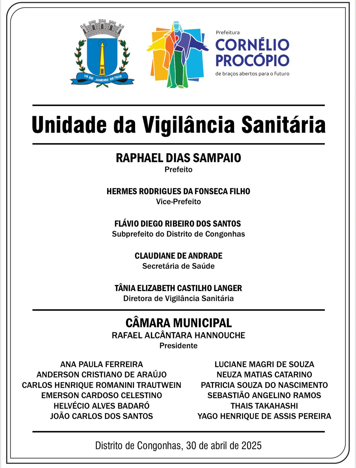 Na manhã desta quarta-feira, o prefeito de Cornélio Procópio, Raphael Sampaio, inaugurou uma unidade da Vigilância Sanitária no distrito de Congonhas. O espaço está localizado na subprefeitura, na Rua Paraná, 559. Os atendimentos serão realizados três vezes por semana — terças, quartas e quintas-feiras, das 8h às 16h30 — e não será necessário agendamento prévio.